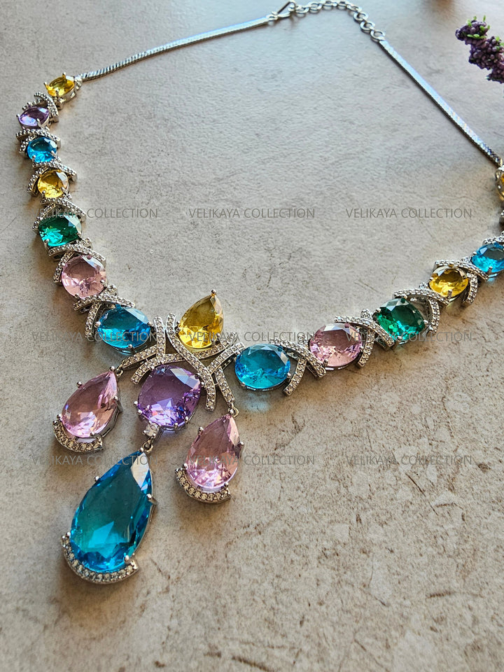 Handmade necklace with brilliant AAA grade cubic zirconia or American diamonds and premium silver plating, set in an elegant design.