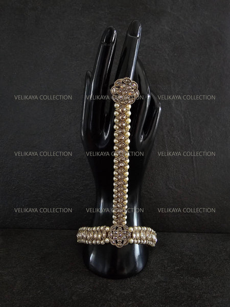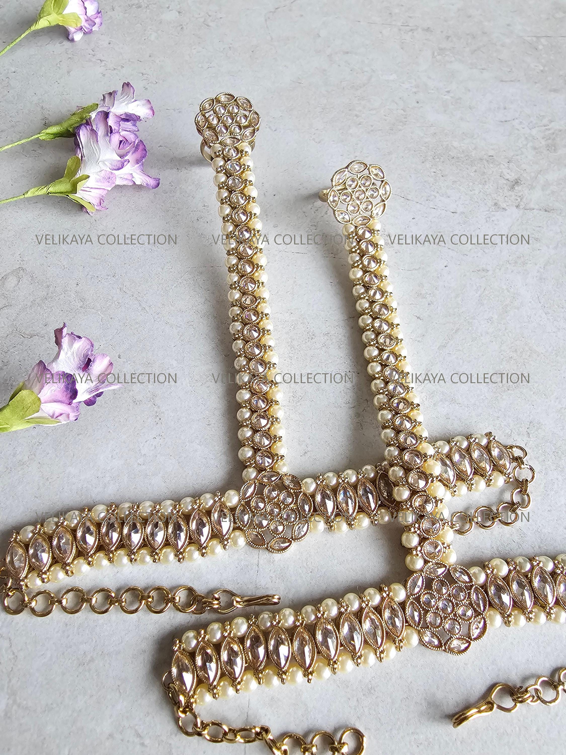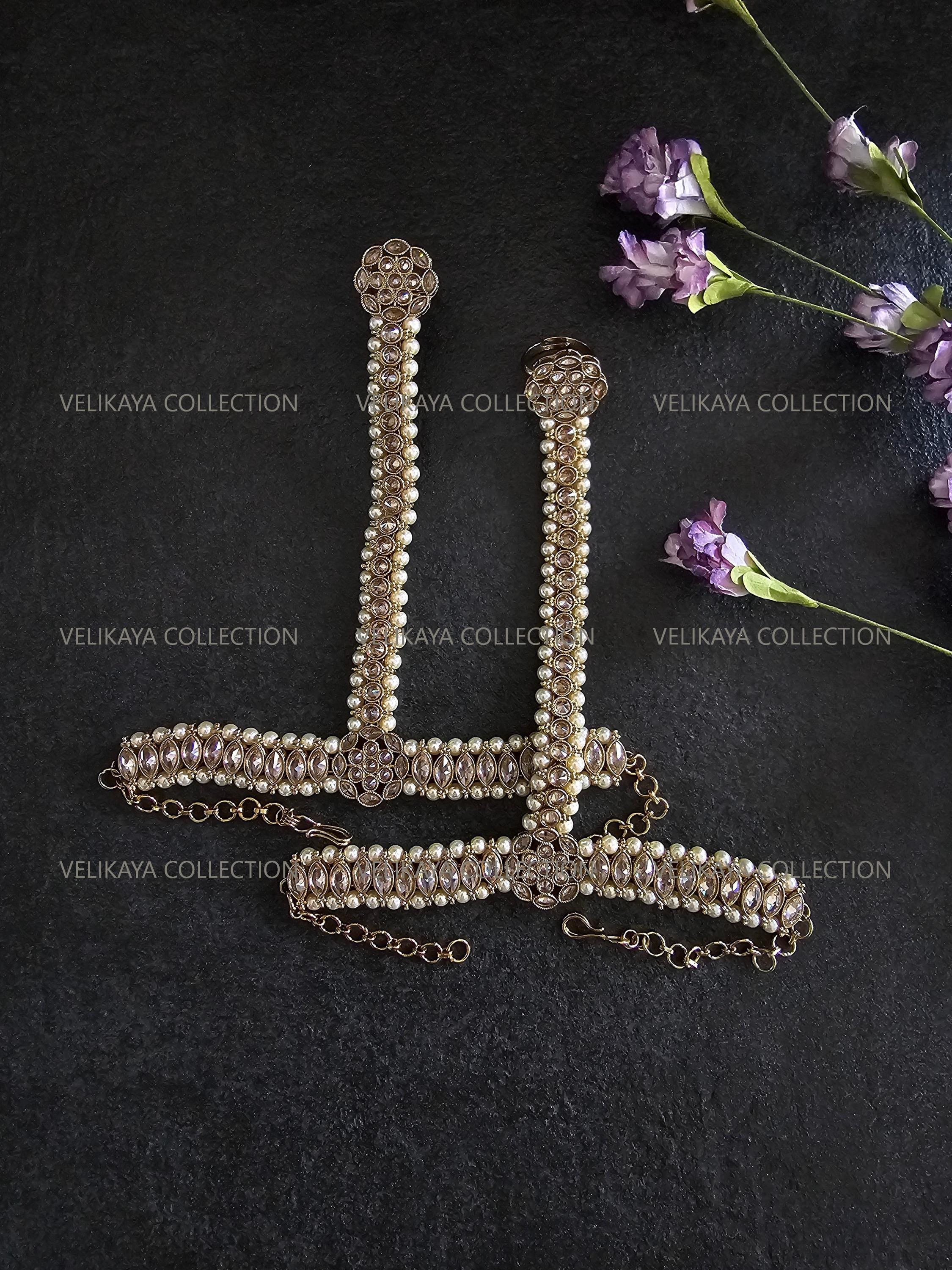 Pair of elegant hathphool / hath panja / hand harness with adjustable ring. Made with high quality champagne stones and antique gold plating.