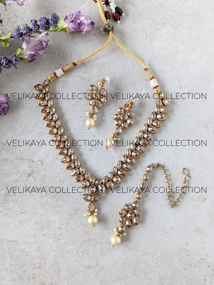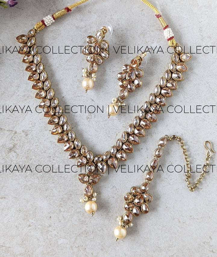 This dainty antique gold necklace comes with pair of elegant earrings and maang tikka that are perfect for wedding guests and bridesmaids for Indian or Pakistani weddings. High quality plating and sparkling champagne stones.