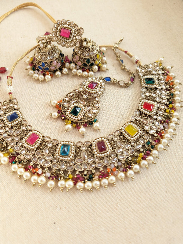 Gold choker necklace set with matching Jhumka earrings and tikka. This is a light weight choker adorned with faux kundan stones and beads. Product Details: - Necklace with adjustable length....