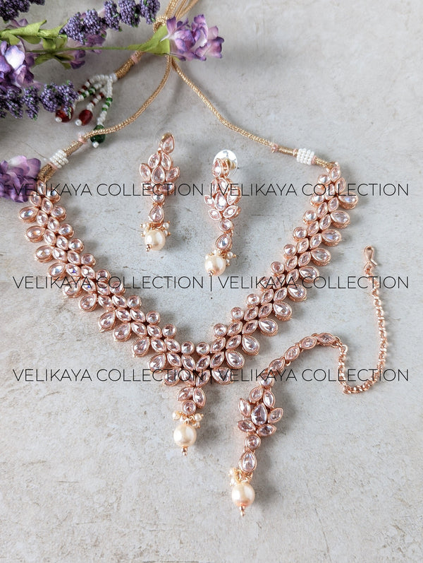 Kim Rose Gold Plated Necklace Earrings and Tikka