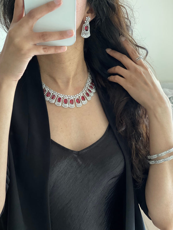 A truly statement choker set complete with earrings and tikka. This stunning choker necklace is made with high quality American diamond / cubic zirconia stones. Paired with beautiful statement earrings....
