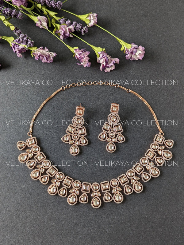 Sophisticated rose gold uncut Kundan and American diamond necklace with statement dangle drop earrings. Made with high quality imitation polki stones, cubic zirconia and rose gold plating. Earring Length -...