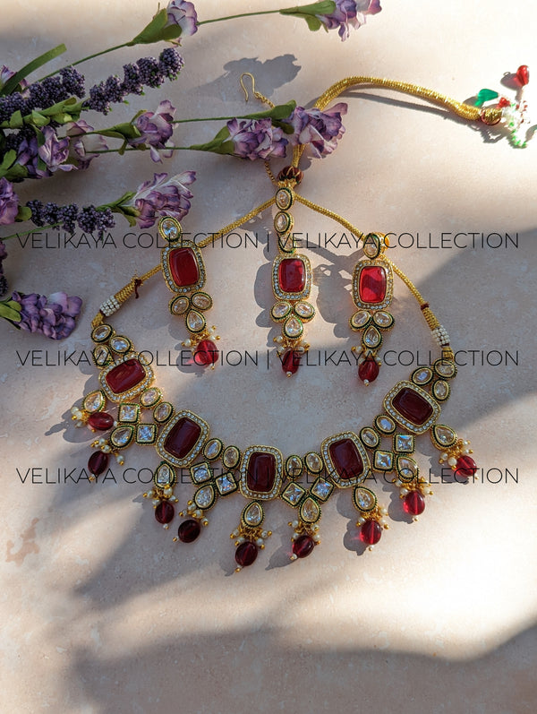 Monalisa Maroon Kundan Necklace Earrings Tikka