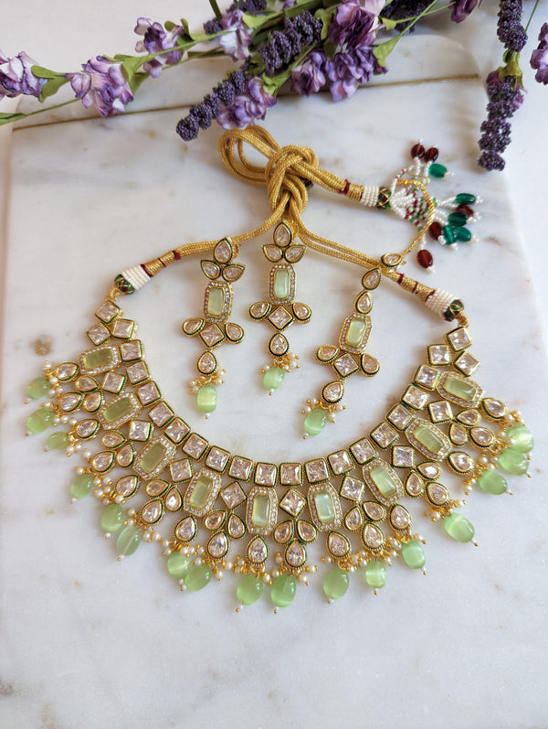 Aurora Mint Kundan Wedding Necklace Earrings Tikka