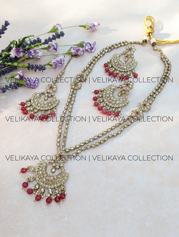 Noor Red Long Polki Necklace with Jhumka & Tikka