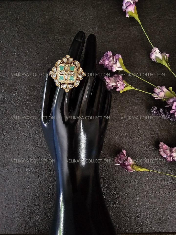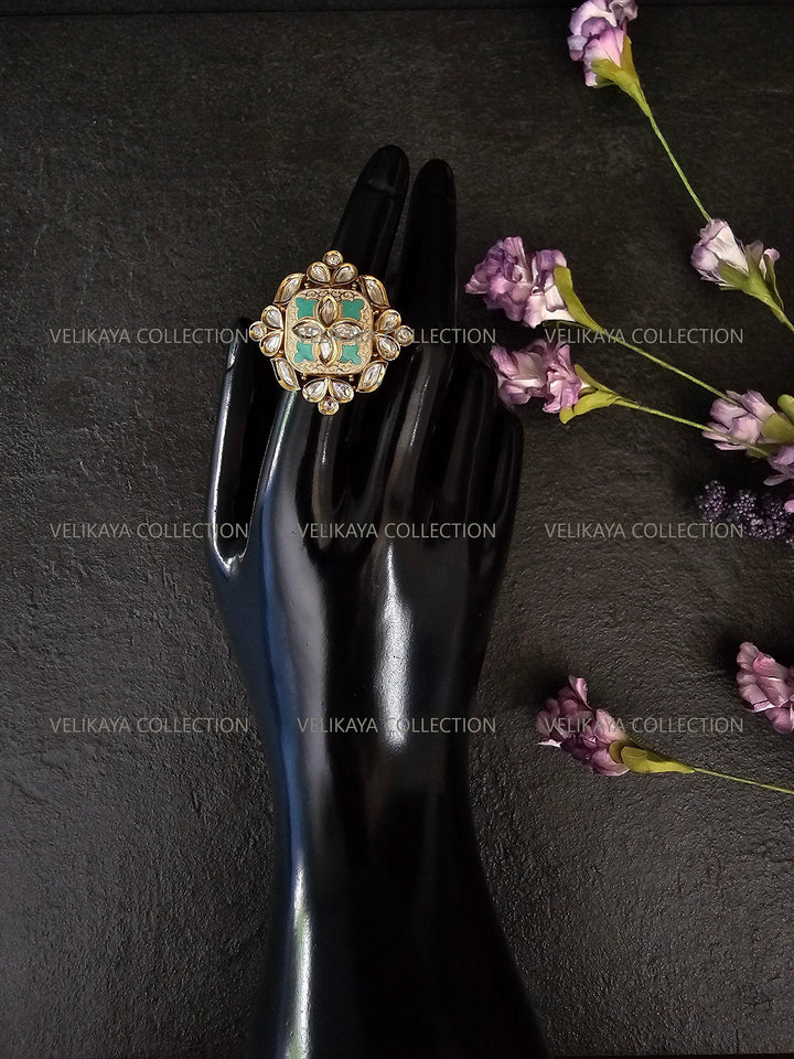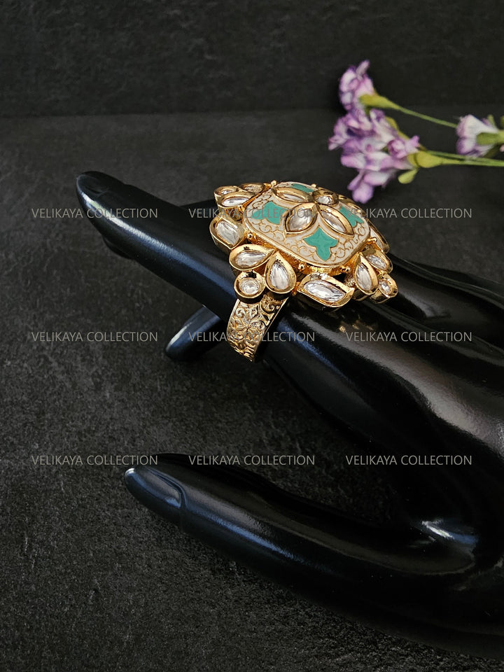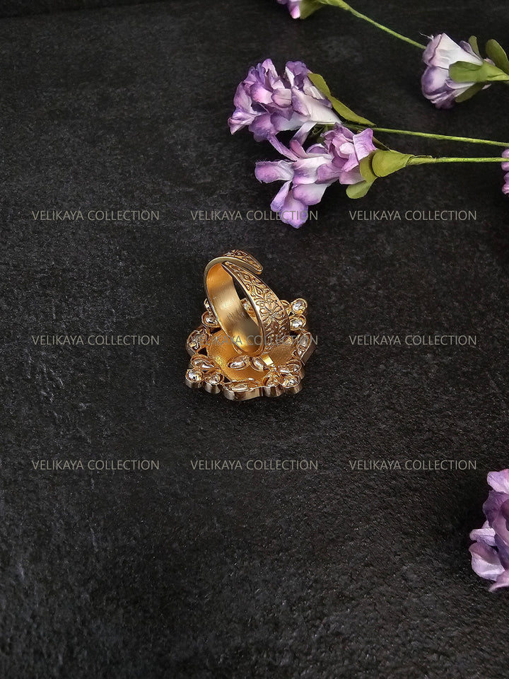 Adjustable kundan meenakari ring with matte gold plating and clear stones. Stones that shine so bright they rival real polki diamonds. Clean, expert craftsmanship that makes this ring stand out from other cheap imitations.