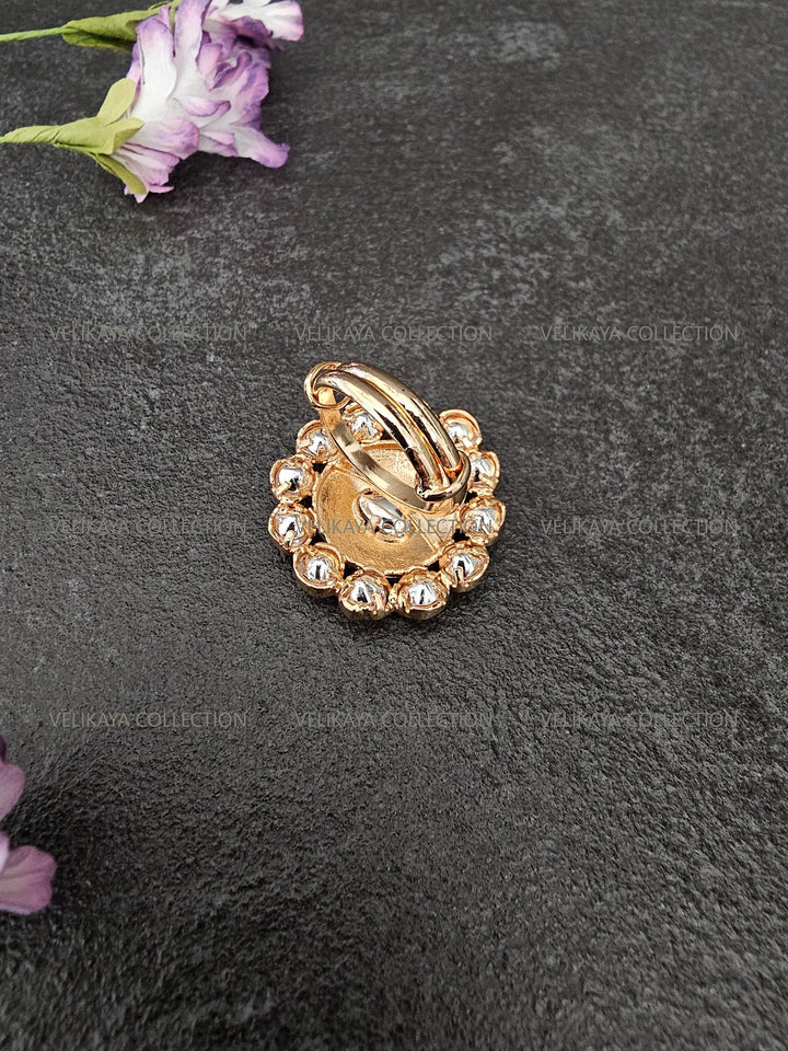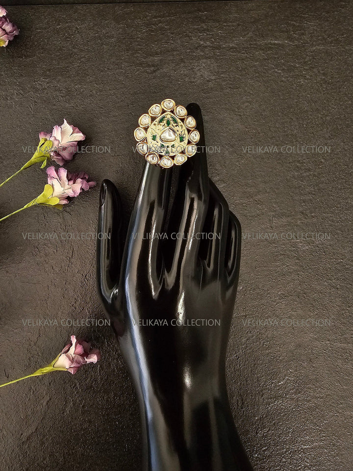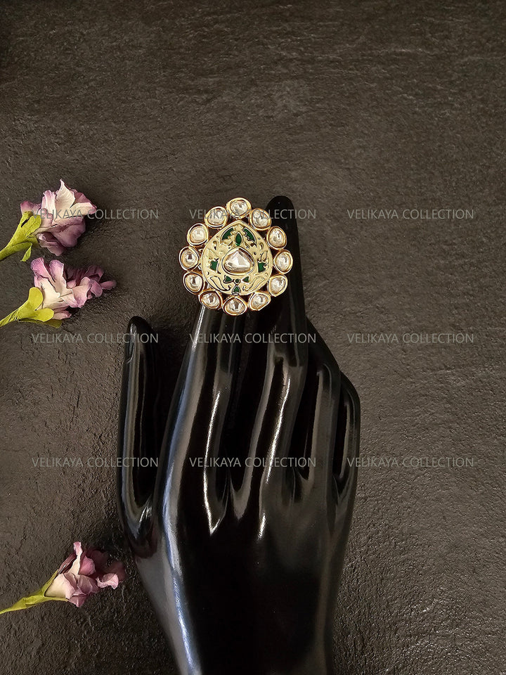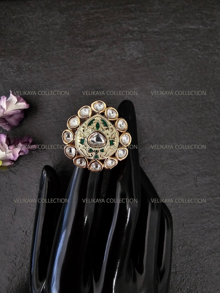 Adjustable kundan ring with gold plating and clear stones. Stones that shine so bright they rival polki diamonds. Beautiful hand painted meenakari work makes this ring one of a kind. Ring has an adjustable band to fit all sizes.