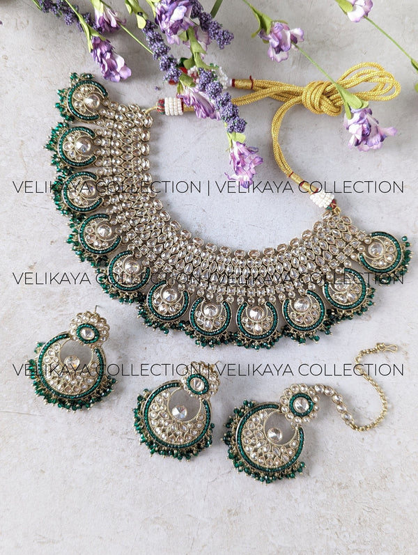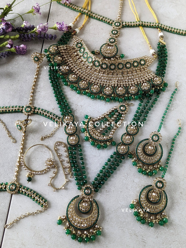 This beautiful emerald green bridal set consists of a statement necklace, earrings and maang tikka. Necklace plating is antique gold. Sparkling champagne stones with superior craftsmanship. Perfect for Indian and...