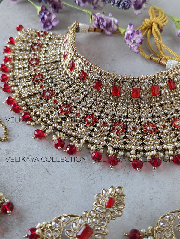 This Jodha style ruby red semi-bridal set consists of a statement necklace, earrings and tikka. Necklace plating is antique gold. Sparkling champagne stones with superior craftsmanship. Perfect for Indian and...