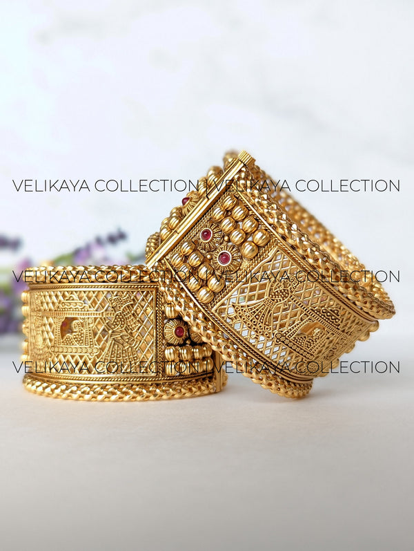 Unique, intricately designed bracelet with a wedding scene depicted in the design. Indian Pakistani Kadey or antique gold plated bracelets perfect for weddings, parties and festivals. This is an openable...