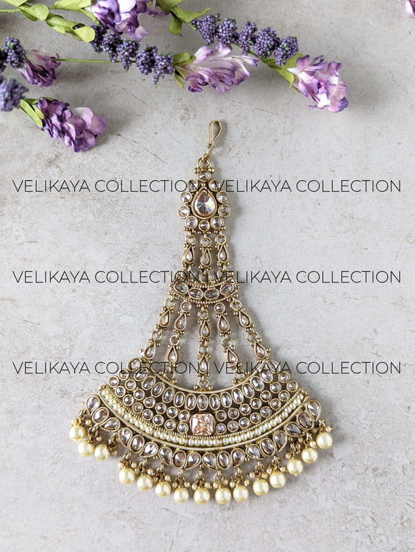 Large antique pasa or jhumar (side tikka) with sparkling clear champagne stones and antique gold polish. A must have hair accessory for any Indian Pakistani bride and guests alike. Length...