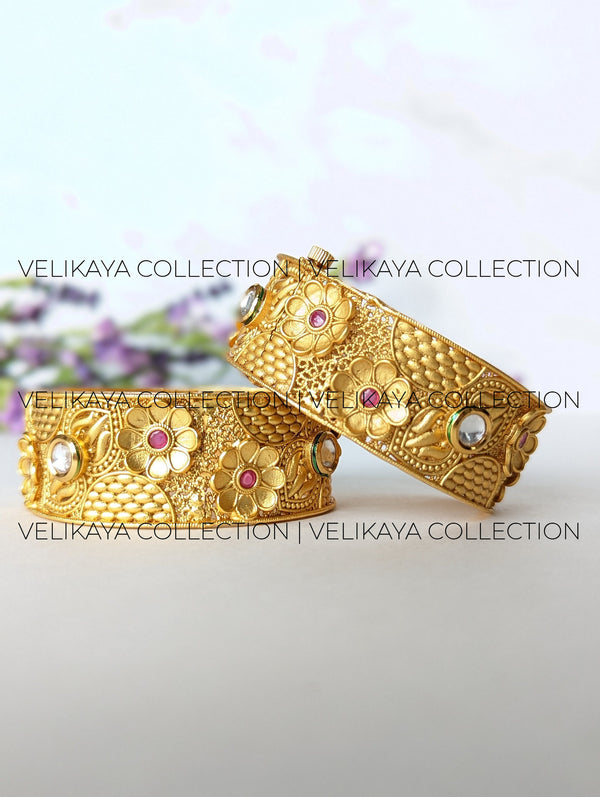 Beautiful flower motif wedding bracelet openable with screw opening. Indian Pakistani Kadey or gold bracelets perfect for weddings, parties and festivals. Intricate design with high quality gold plating. Bracelet width -...