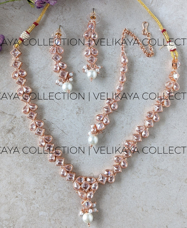 Ada Rose Gold Plated Necklace Earrings and Tikka