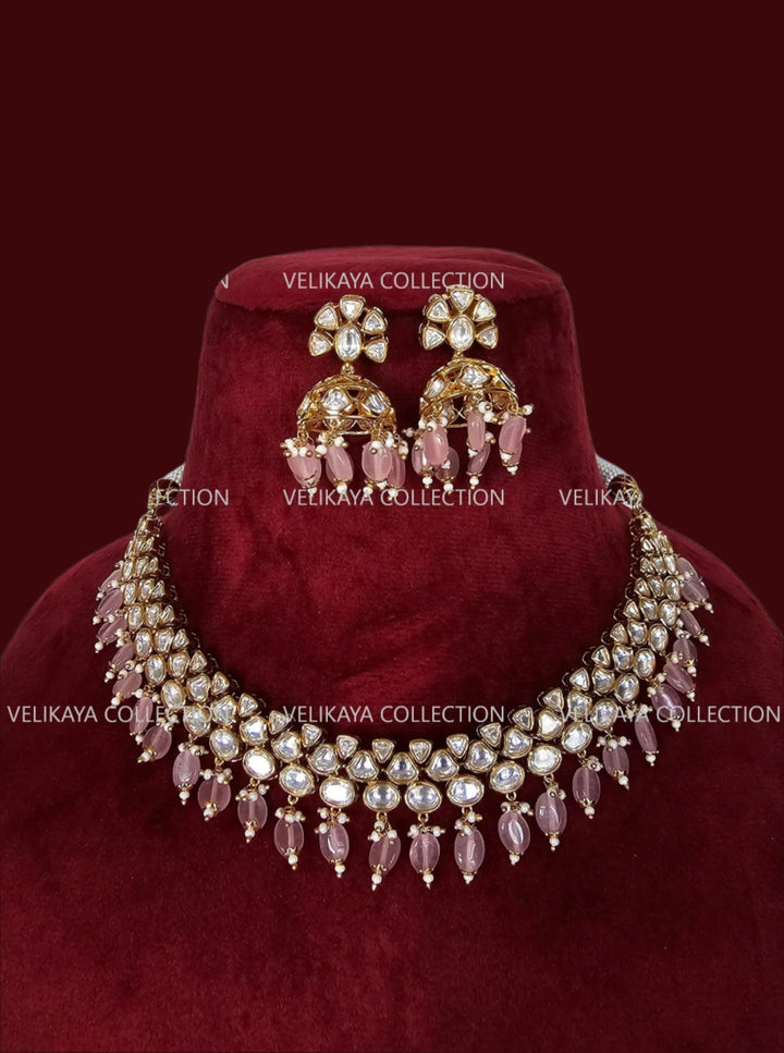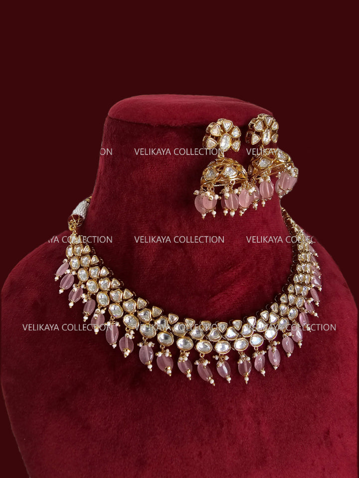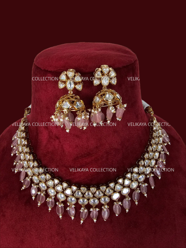 Premium Gold Plated Kundan Necklace Set with beautiful kundan jhumka earrings. Adorned with elegant pink beads. Stones firmly set in silver foil. Not glued.
