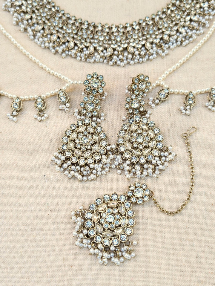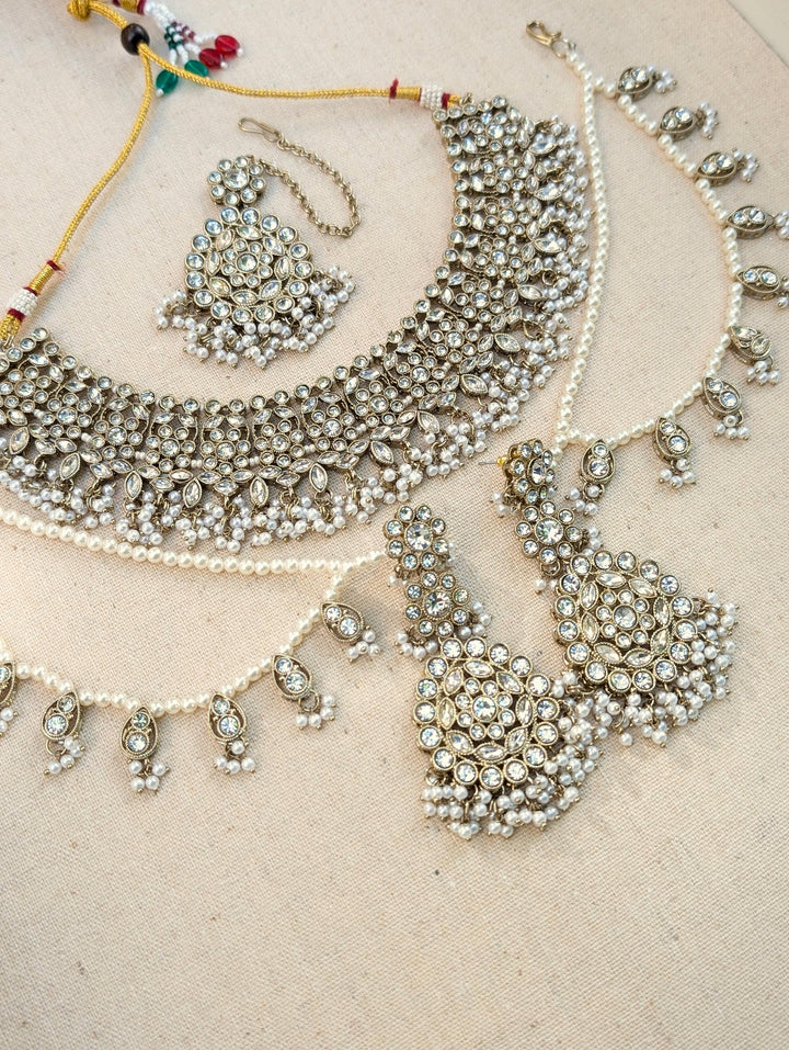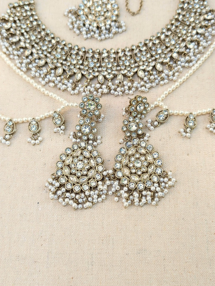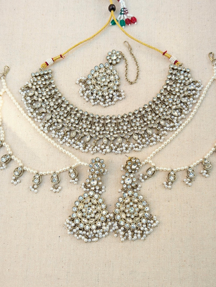 White polki necklace with beautiful clear stones and beads. Paired with equally stunning long earrings with ear chain or sahare.