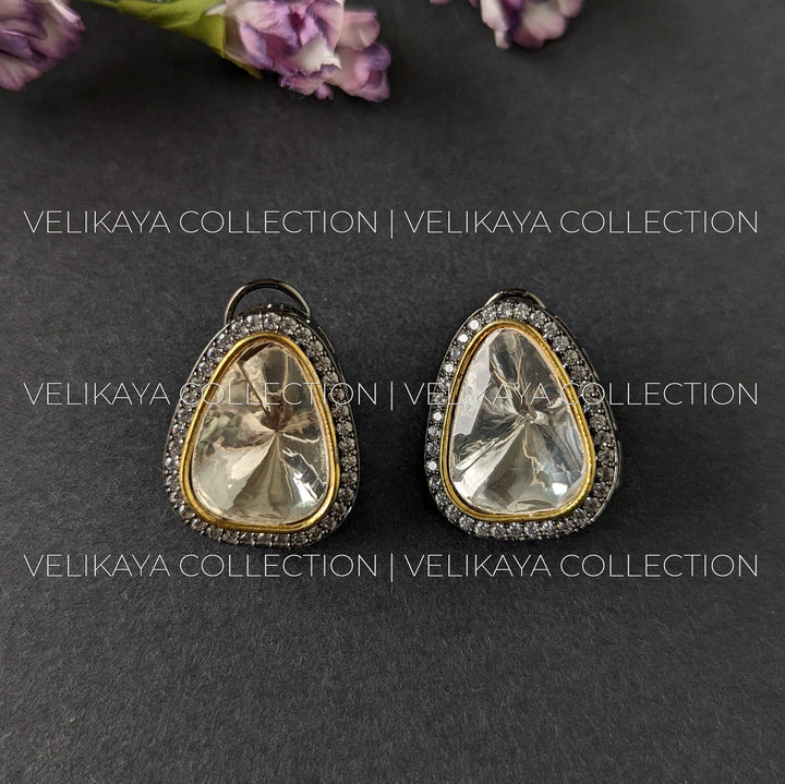 Dual tone black and gold statement studs with clear polki stones and black rhodium plating. Lined with beautiful cubic zirconia crystals. Perfect for a night out, parties and Indian Pakistani weddings.