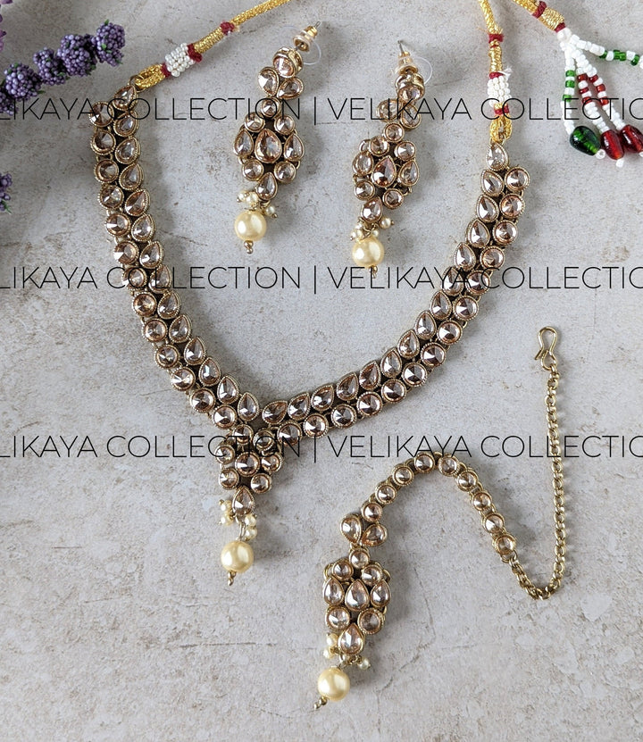 This dainty antique gold necklace comes with pair of elegant earrings and maang tikka that are perfect for wedding guests and bridesmaids for Indian or Pakistani weddings. High quality plating and sparkling champagne stones.