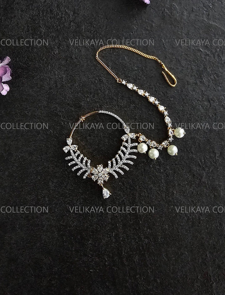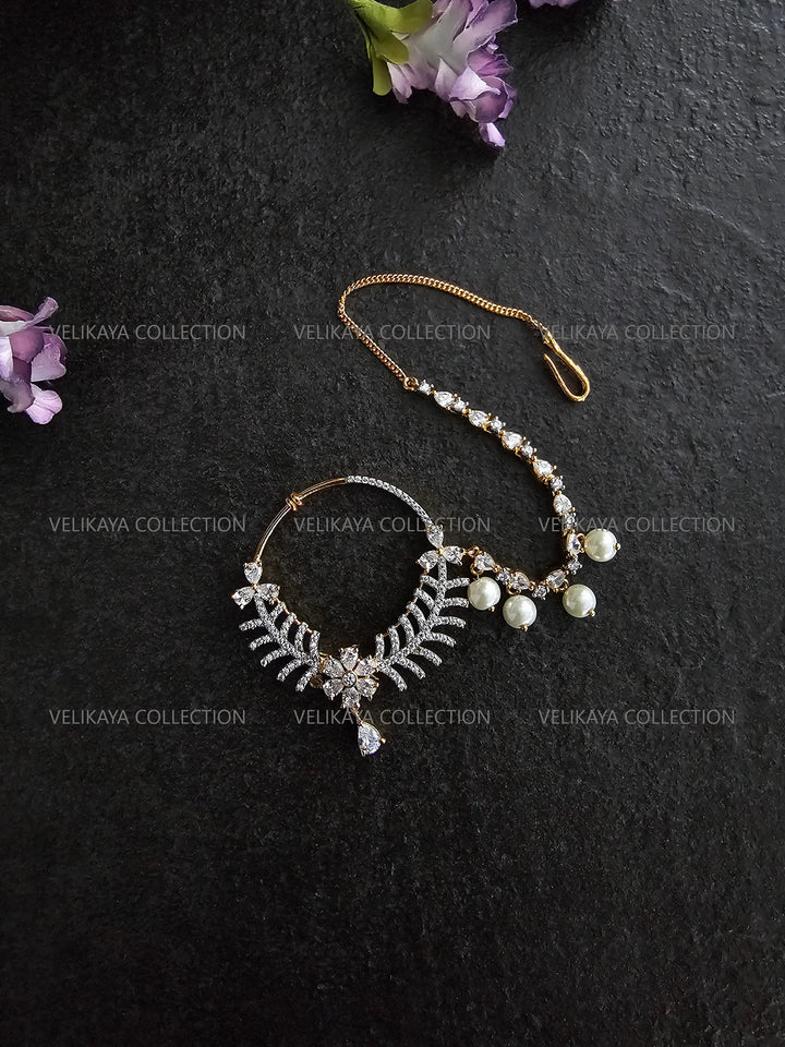 Stunning nose ring with brilliant zirconia / CZ / American diamond stones. Beautiful intricate design. Comes with a stone and pearl chain attached.