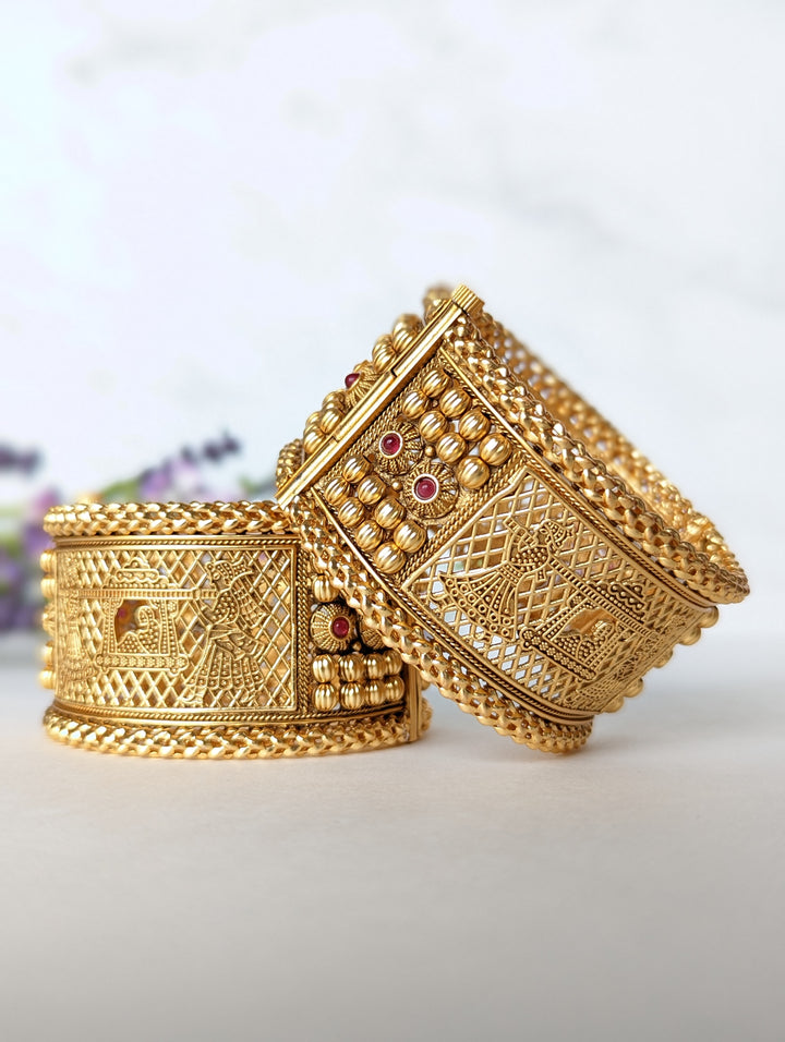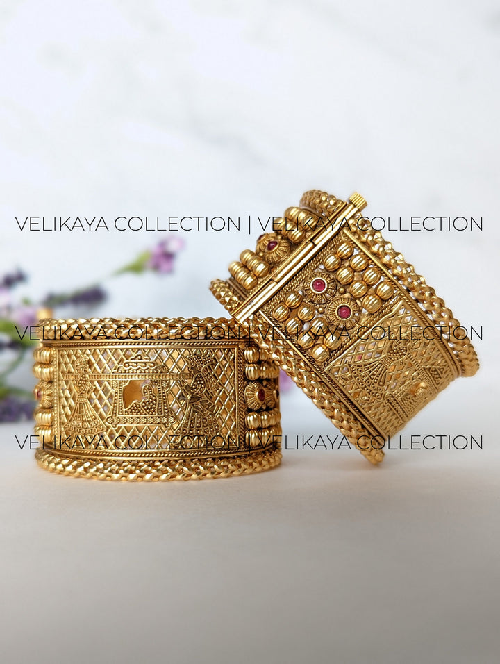 Unique, intricately designed bracelet with a wedding scene depicted in the design. Indian Pakistani Kadey or antique gold plated bracelets perfect for weddings, parties and festivals. This is an openable bracelet with screw opening. Bracelet Width - 4 cm approx.
