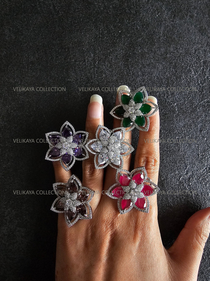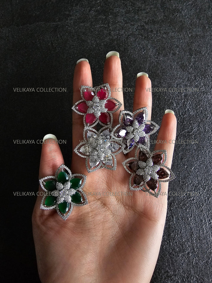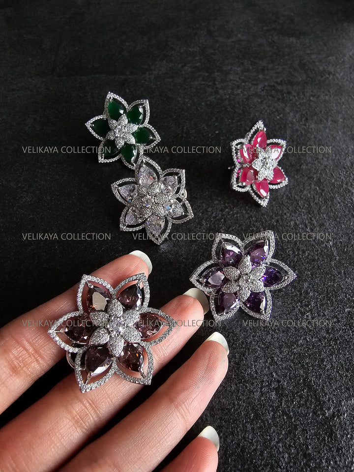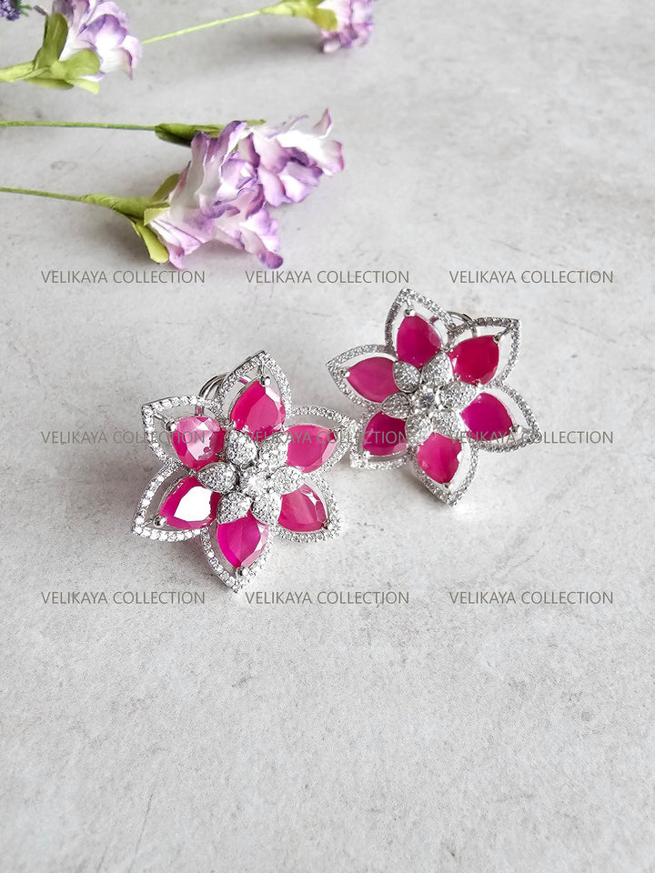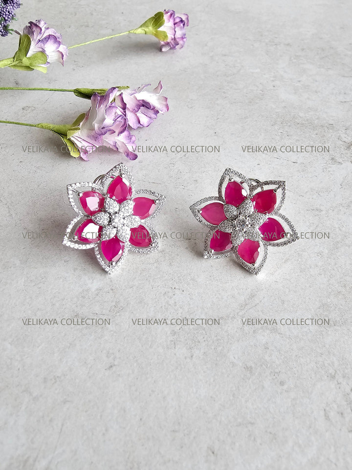 Stunning floral American diamond / CZ studs with beautiful silver rhodium plating and cubic zirconia stones. Perfect for a night out, parties and weddings.