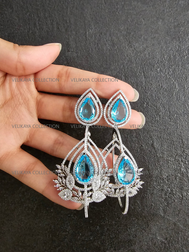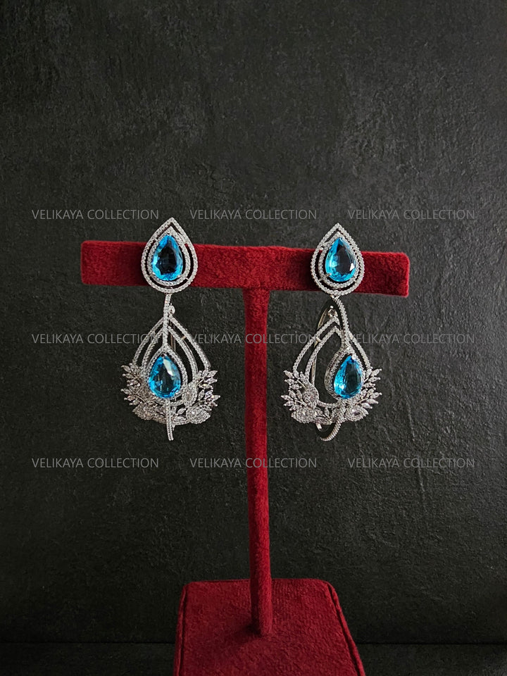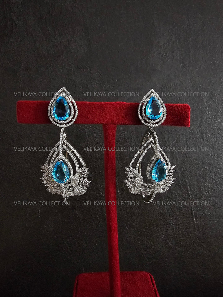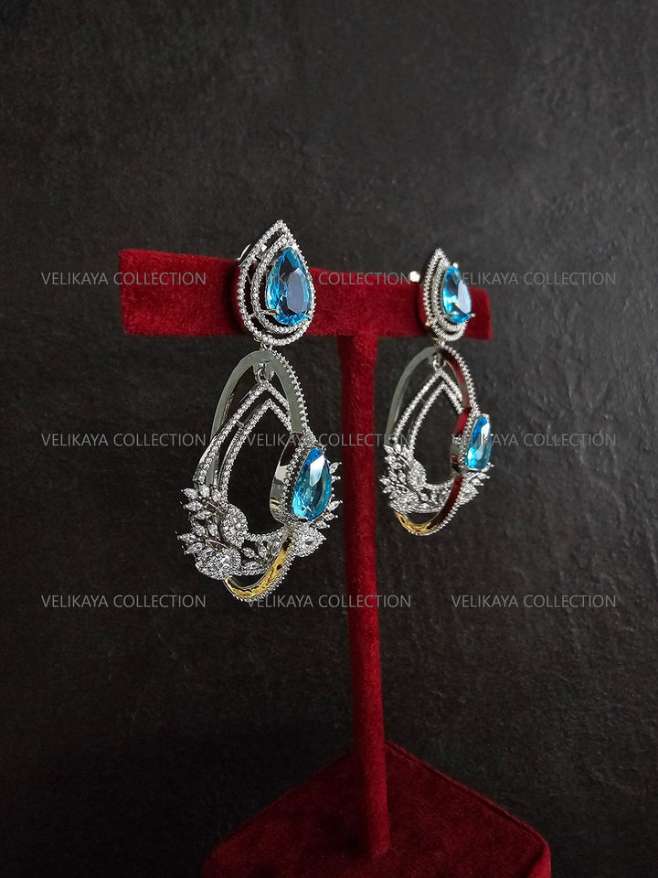 Statement dangle drop earrings in silver plating. Unique and elegant design. Made with highest quality CZ diamonds. Ideal for weddings and parties.