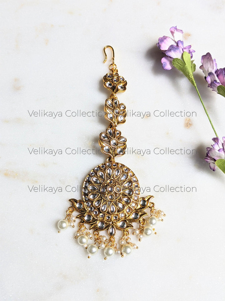 A must have hair accessory for brides, bridesmaids and wedding guests alike. This maang tikka measures 12 cm long top to bottom and up to 5 cm wide at the base. Gorgeous yellow gold plating and white faux pearls.