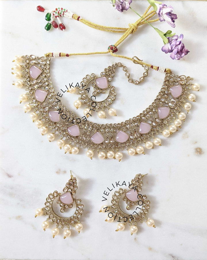 Traditional polki necklace set with beautiful champagne stones. Antique gold plating and soft pink center stones. Necklace has adjustable zari cord to fit all sizes. Earrings for pierced ears. Comes with matching maang tikka. Handmade in India with premium quality materials and craftsmanship.