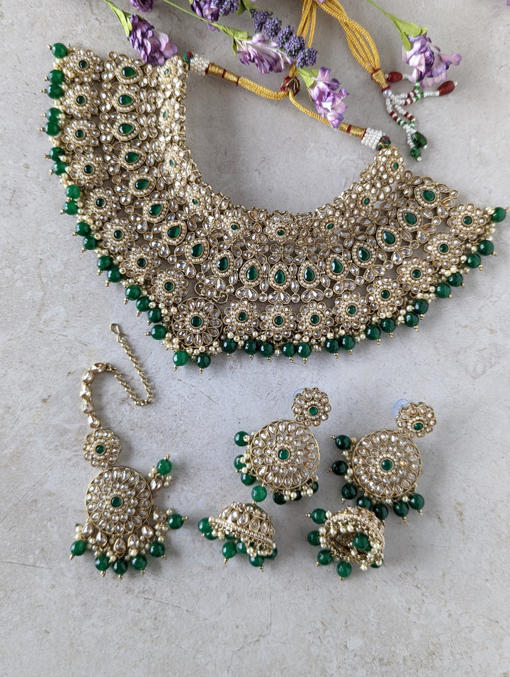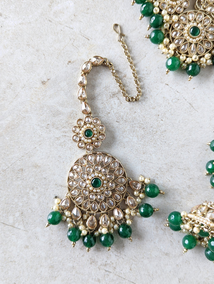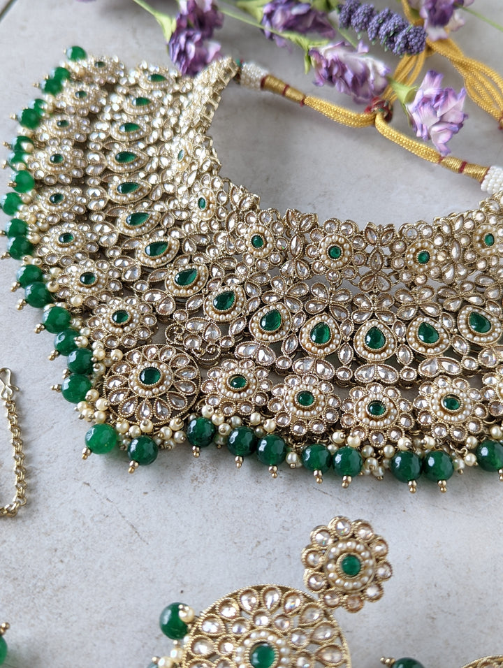 This Jodha style emerald green bridal set consists of a statement necklace, earrings and tikka. Necklace plating is antique gold. Sparkling champagne stones with superior craftsmanship.