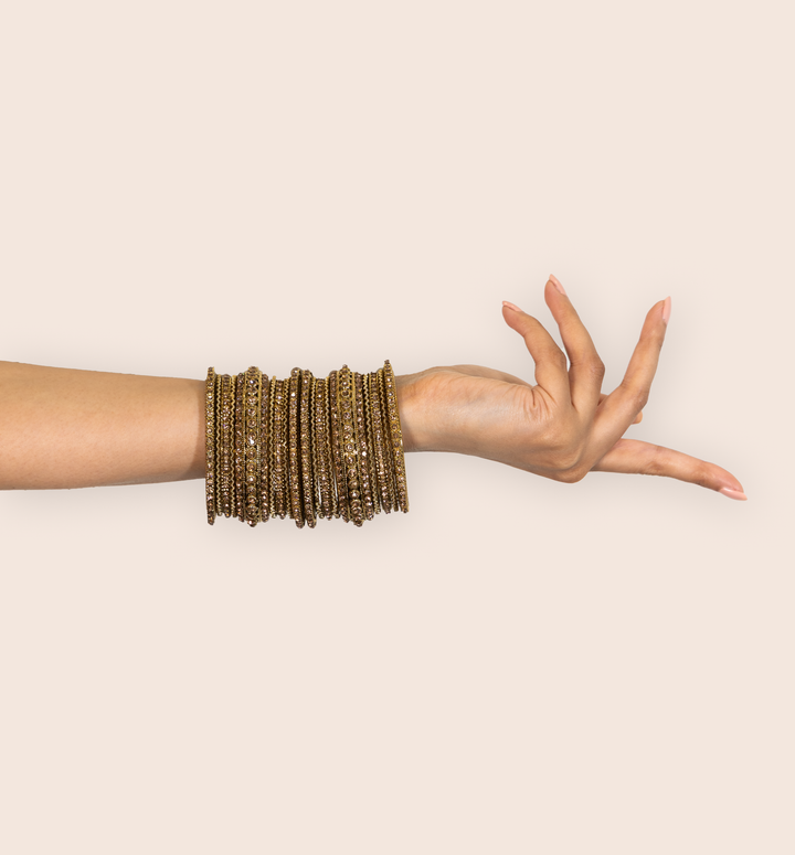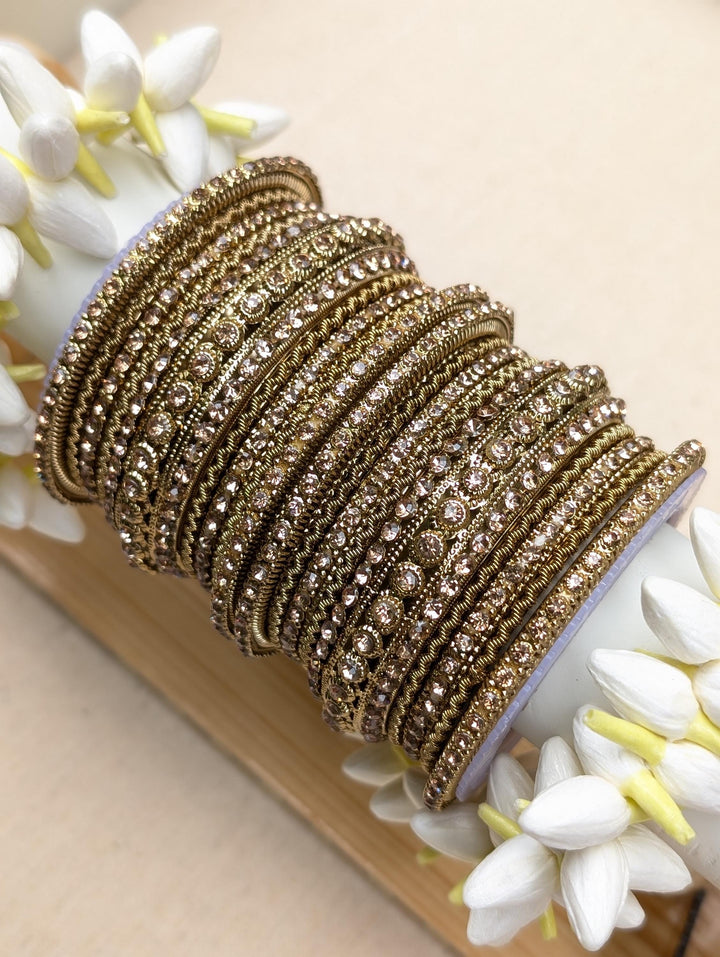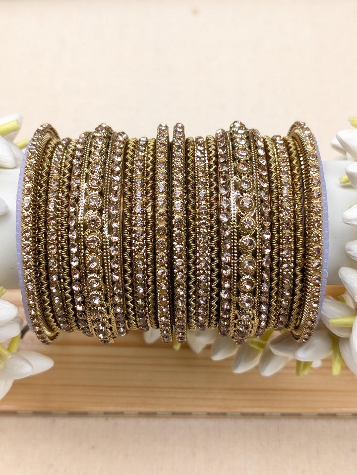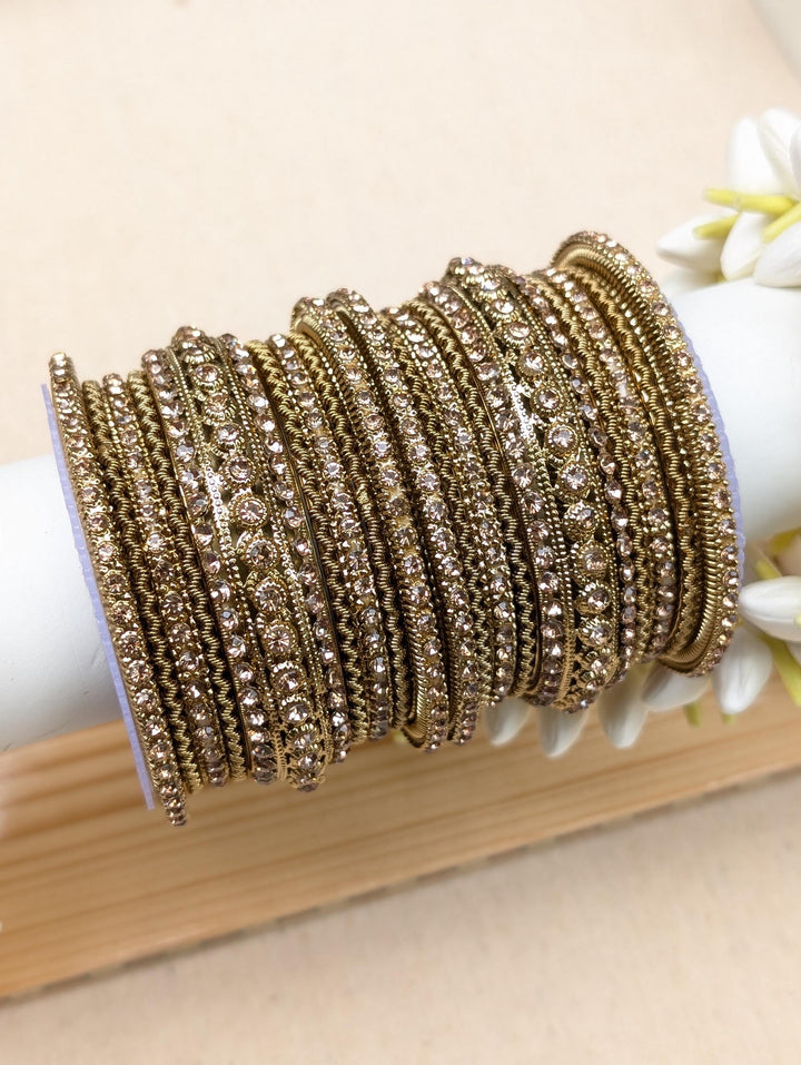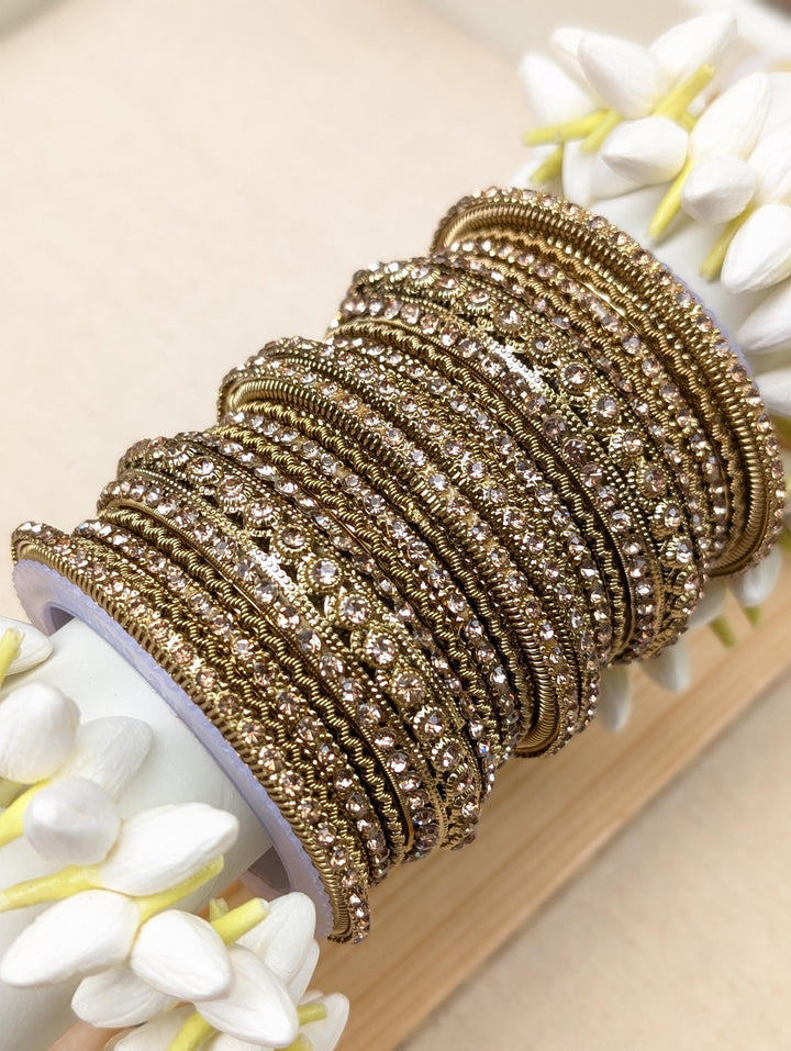 Blingy wedding bangles set for a perfect wedding look. Antique gold bangles set embellished with champagne colored stones. Wear the set on its own or mix with plain bangles to create a unique set of your own.