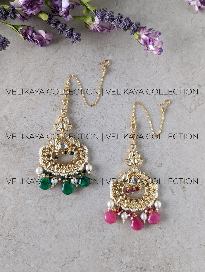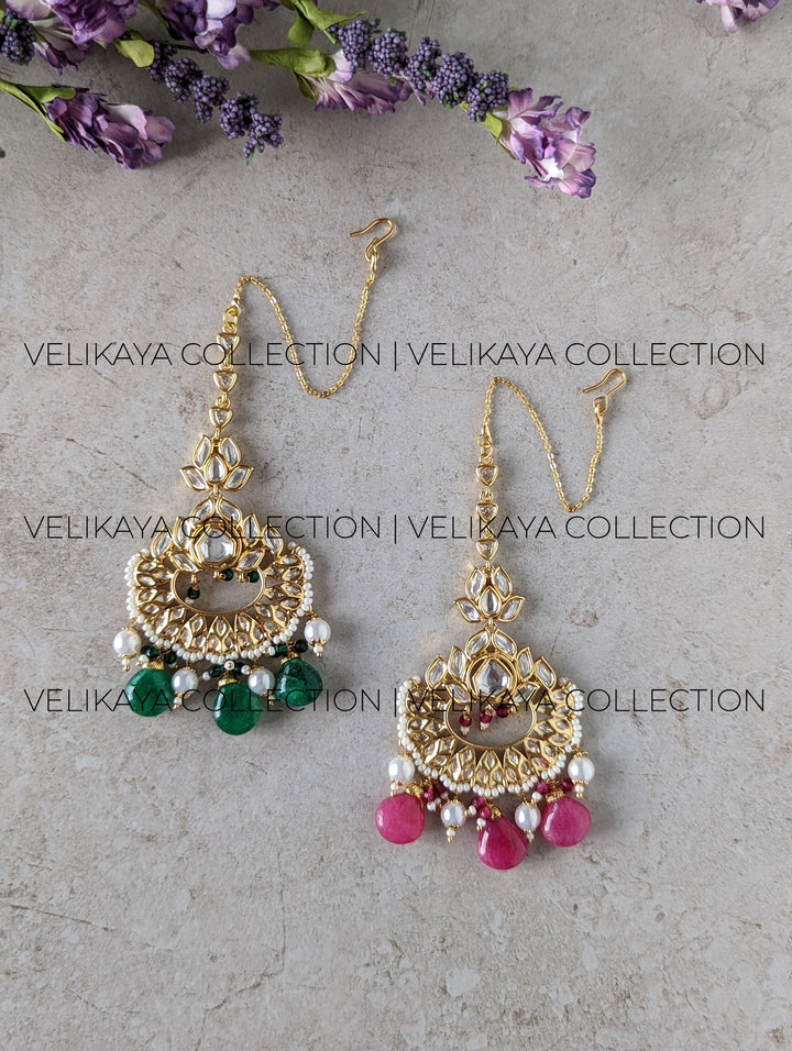 Elegant uncut kundan maang tikka with 22K matte gold plating and superior imitation polki stones. Pair this delicate tikka with one of our fine kundan studs or earrings for a sophisticated modern look.