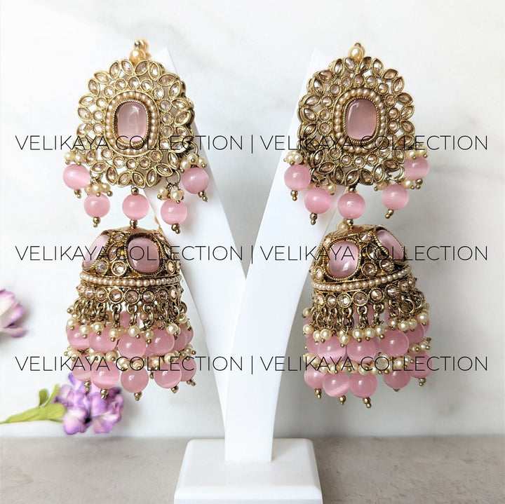 Large statement jhumkas with beautiful colored stones and antique gold plating. This is the only piece of jewelry you will need to stand out among guests at any Indian or Pakistani wedding.