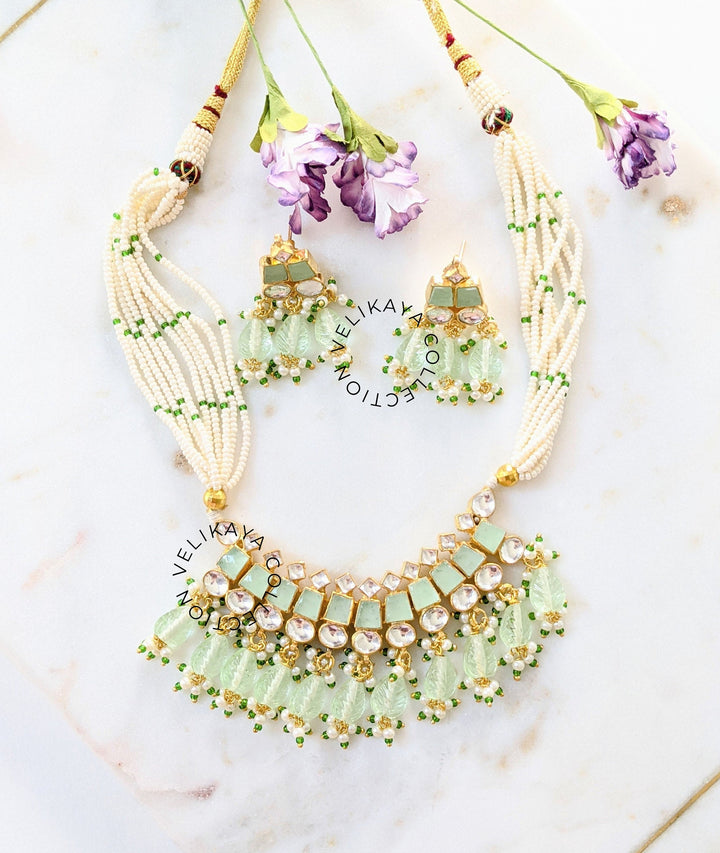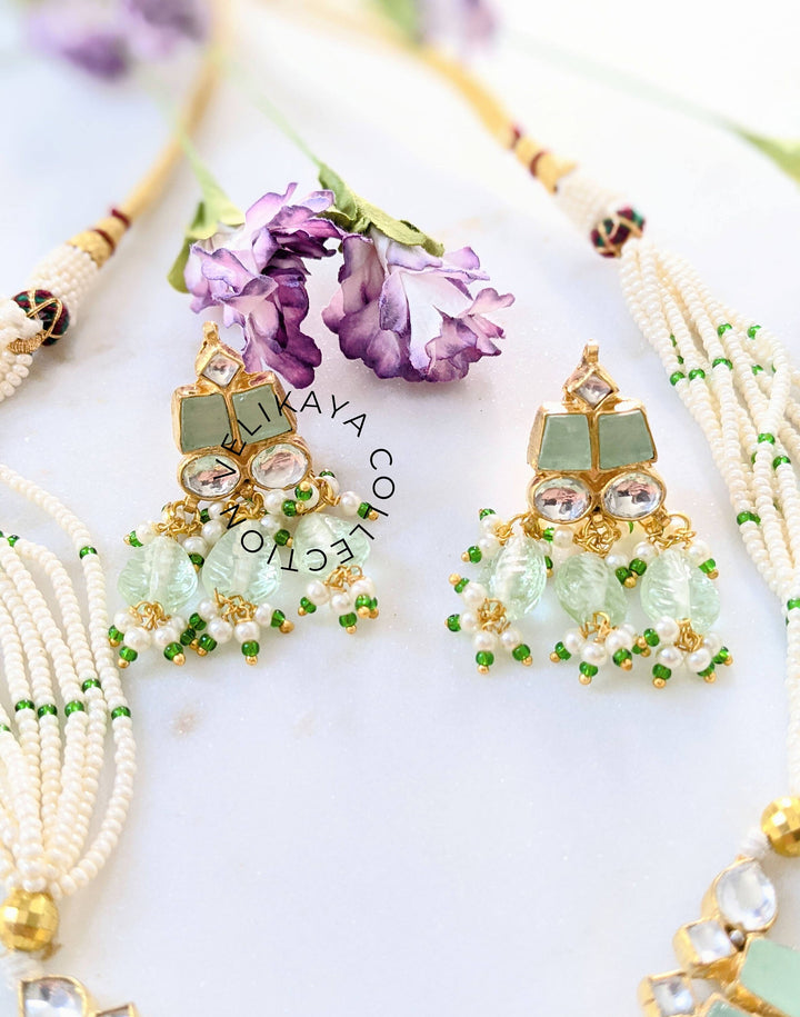 Dainty gold plated Kundan necklace in pastel green stones and multiple strands of pearls. Paired with equally elegant earrings. This set embodies the freshness of spring with its beautiful pastel colors and delicate design.