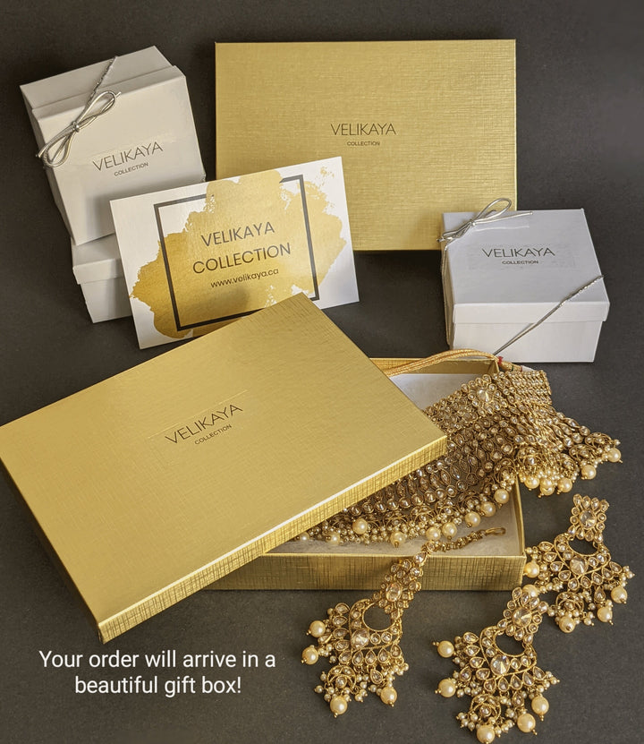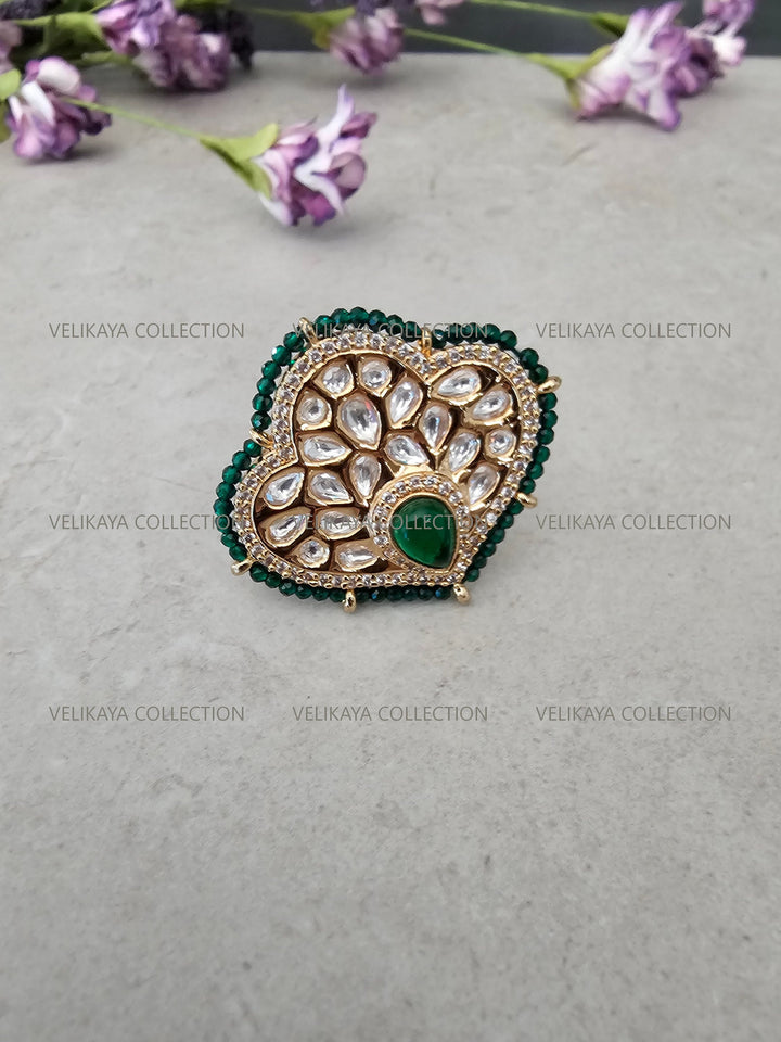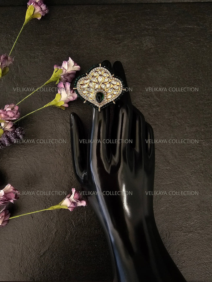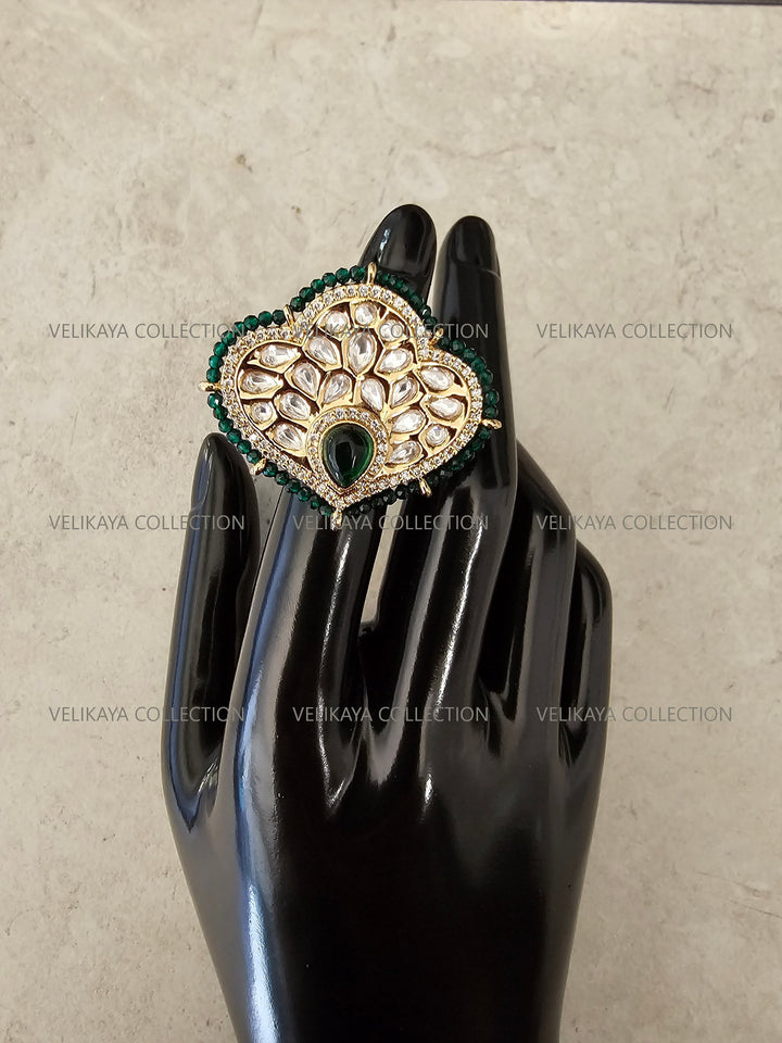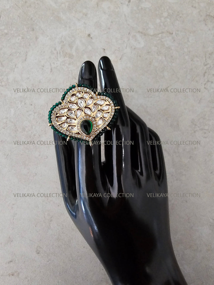 A truly magnificent and unique Kundan Polki ring in the shape of 'Paan' or Betle leaf, with gold plating and clear stones. Adjustable band. Perfect for Indian, Pakistani and other South Asian events and weddings.