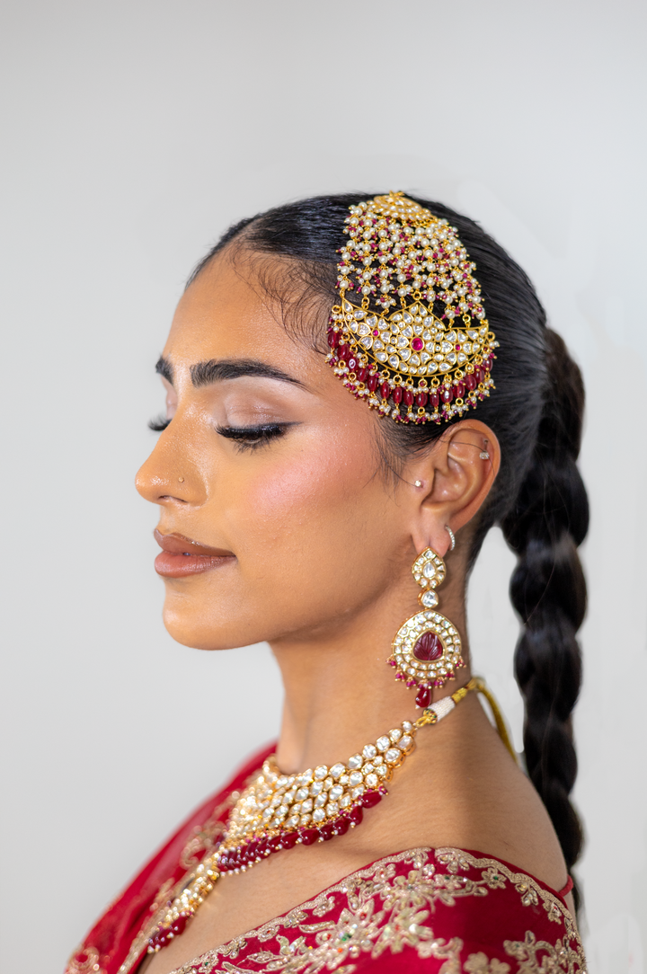 Luxurious uncut kundan pasa with 22K gold plating, superior imitation stones and multifaceted ruby beads. Pair this gorgeous pasa / jhumar with one of our pachi kundan or uncut kundan necklace sets for your ultimate royal wedding look.