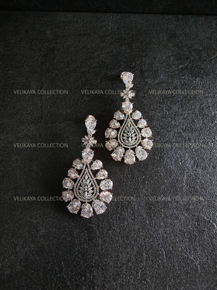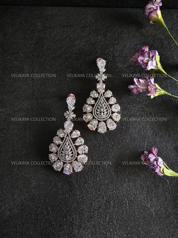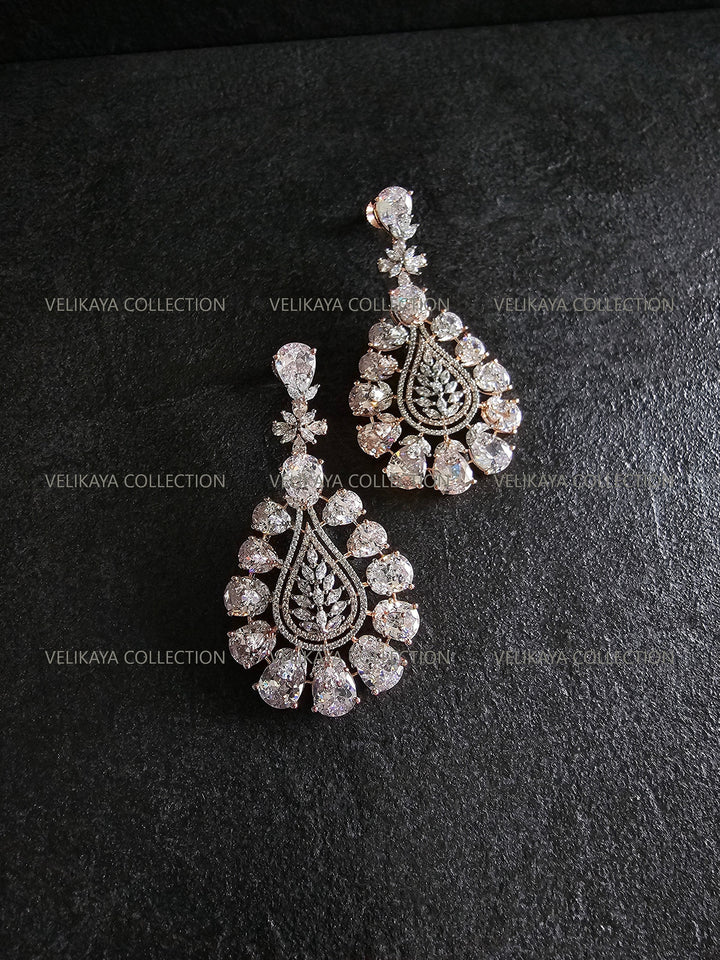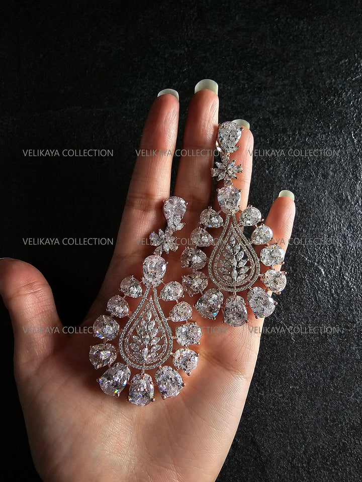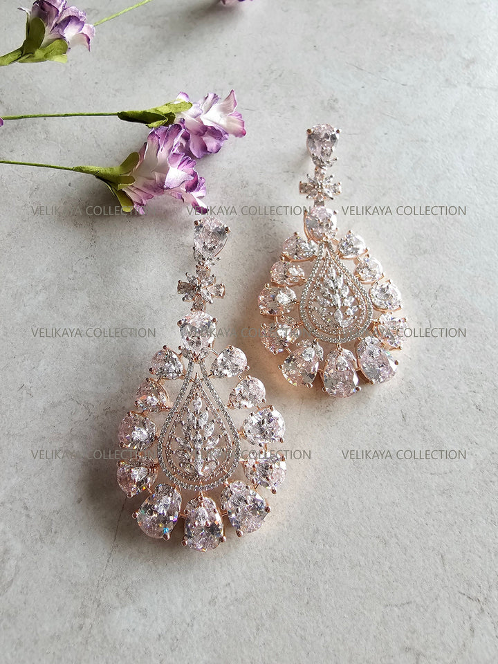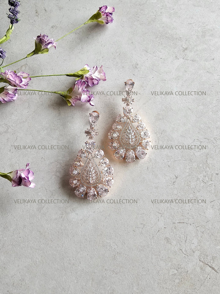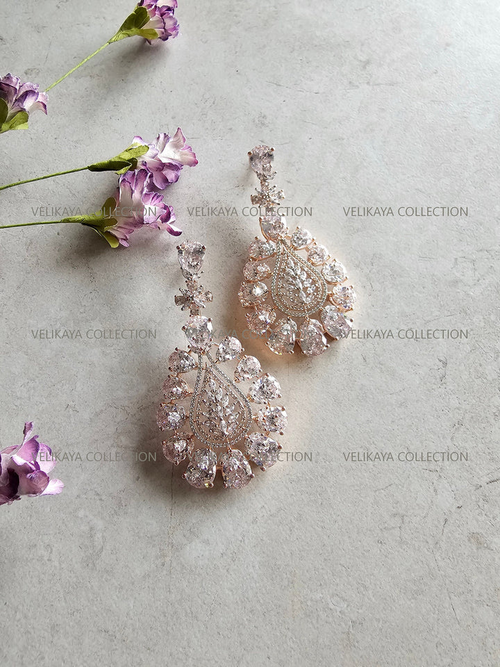 Statement party wear earrings in rose gold plating. Stunning design with large CZ stones. Made with highest quality American diamonds aka cubic zirconias. Statement earrings ideal for weddings and parties when you need to stand out from the crowd.