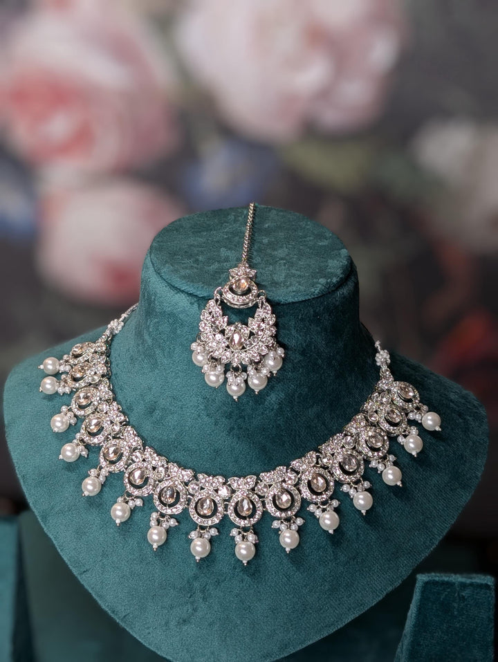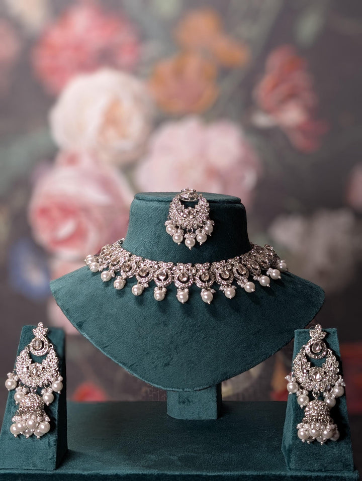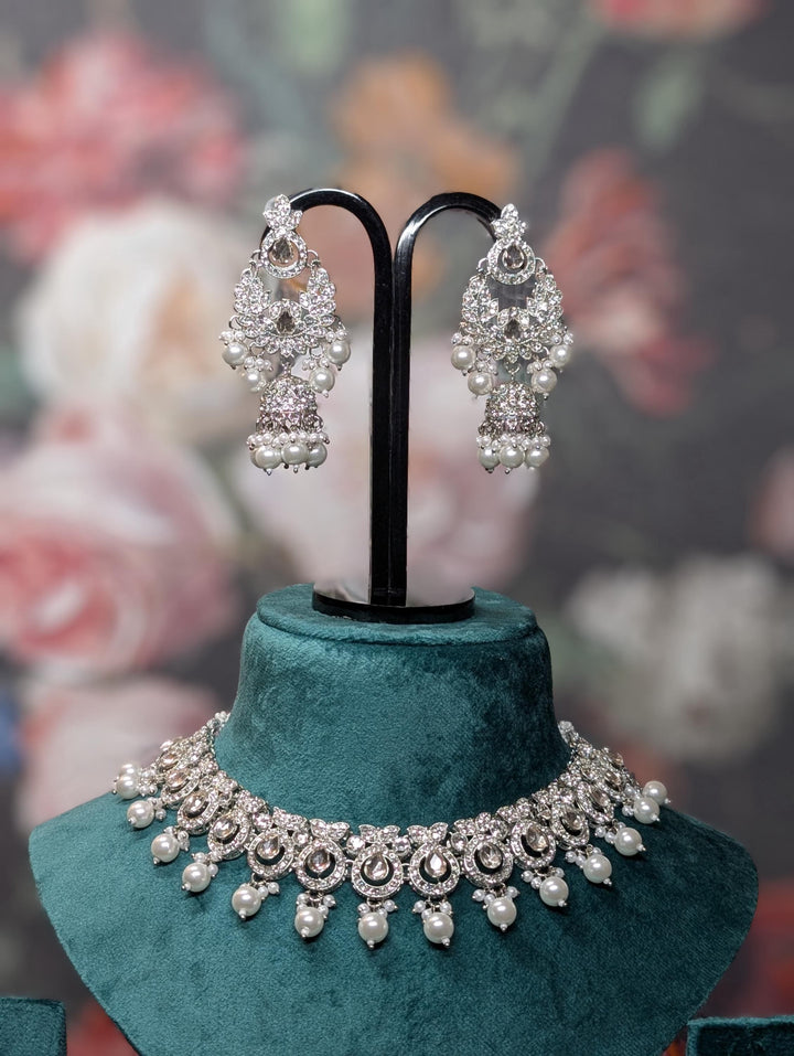 An ethereal white and silver polki necklace set paired with delicate jhumkas and tikka. This versatile necklace can be worn as a choker or flat.