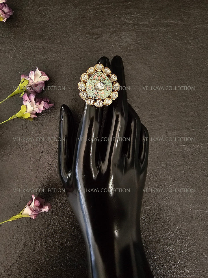 Meenakari Kundan Ring - Mint Pink