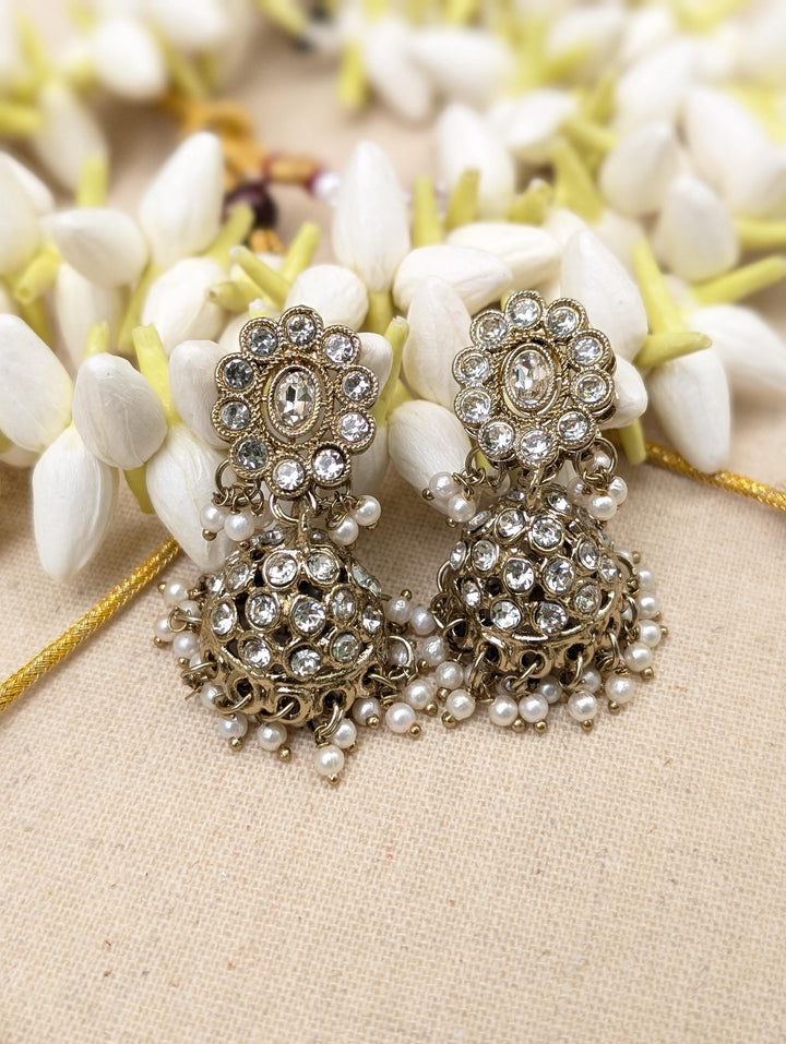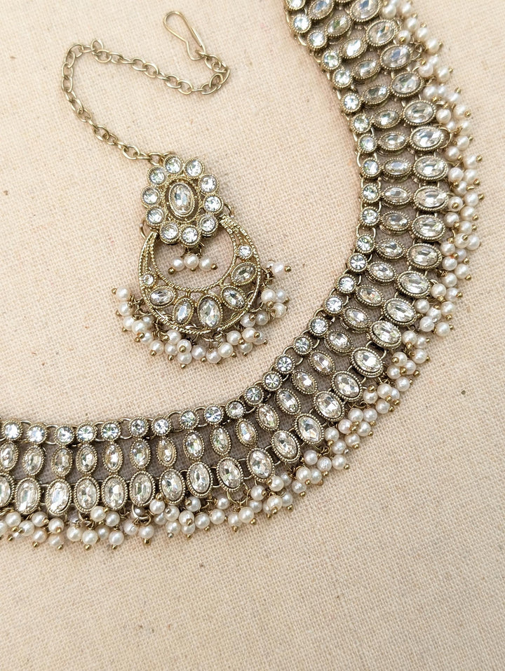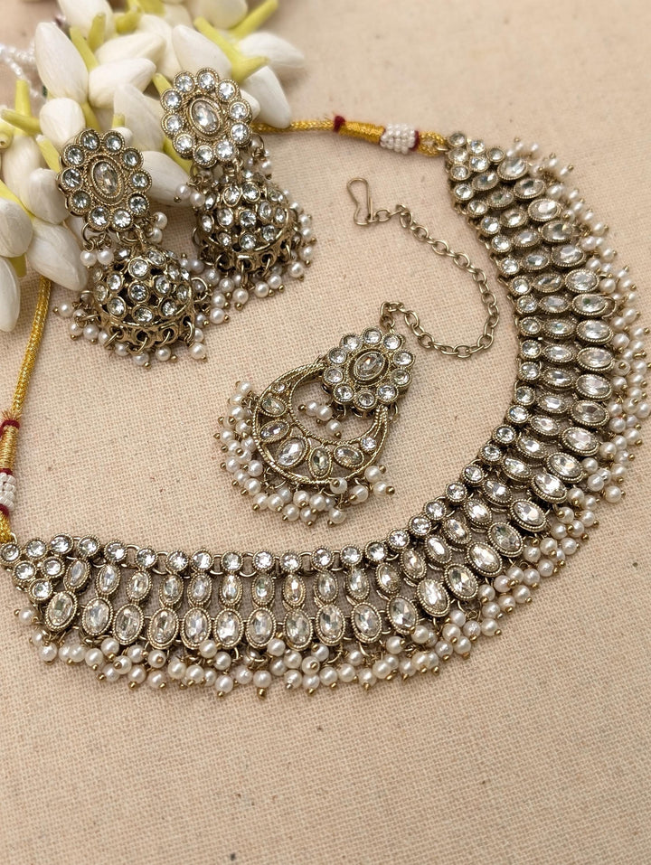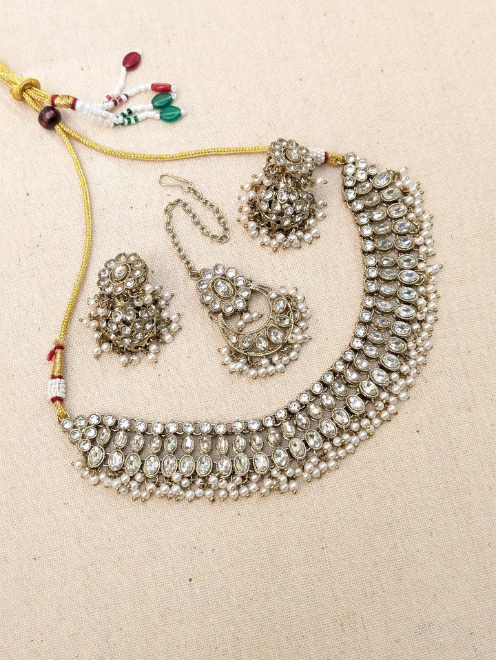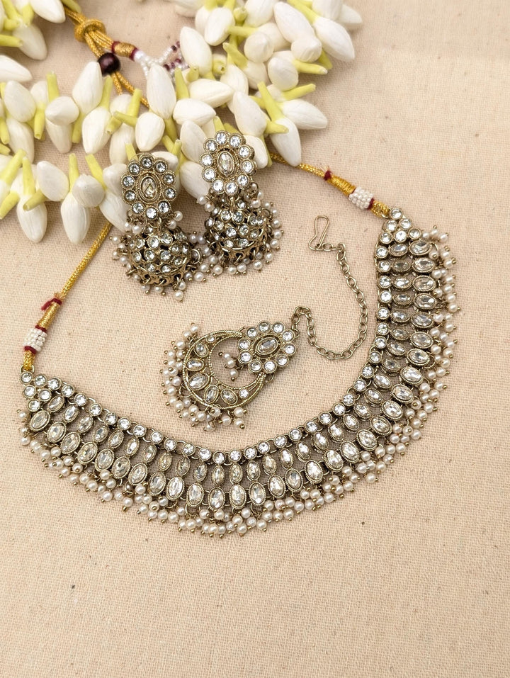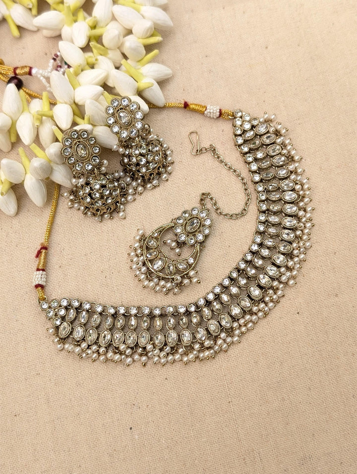 Beautiful polki choker necklace in antique plating and white polki stones. Paired with matching delicate jhumka and tikka. Highest quality and craftsmanship. Perfect for a more minimalist wedding jewelry look.