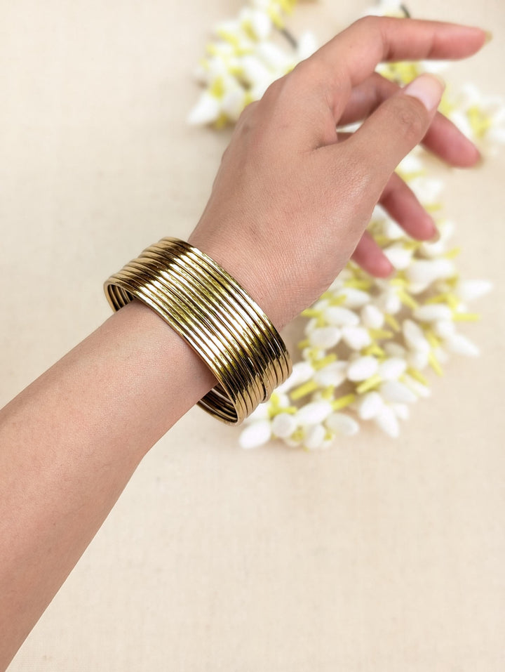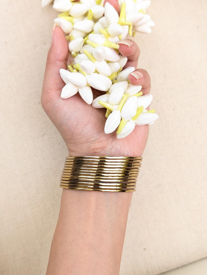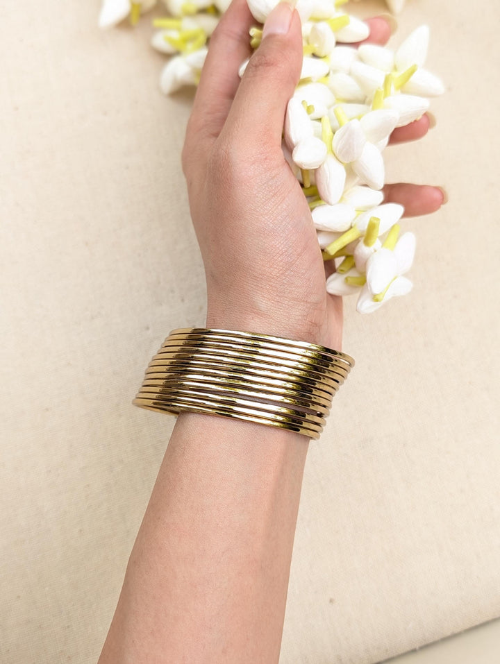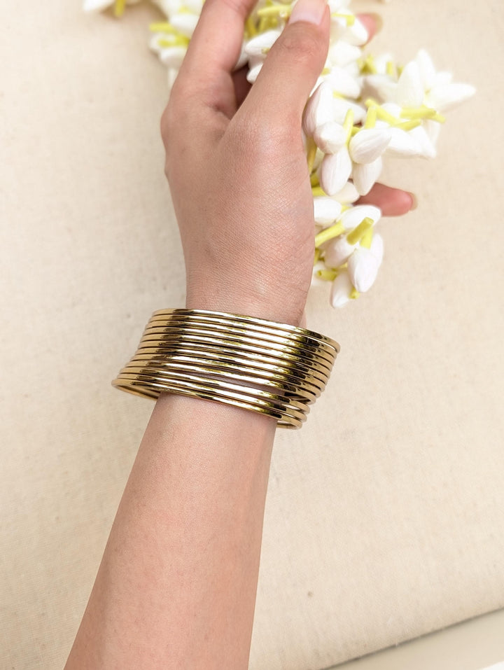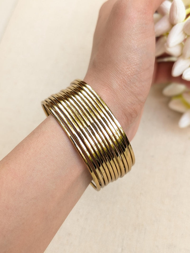 Set of 12 minimalist metal bangles in gold to add a special touch to your everyday outfits.