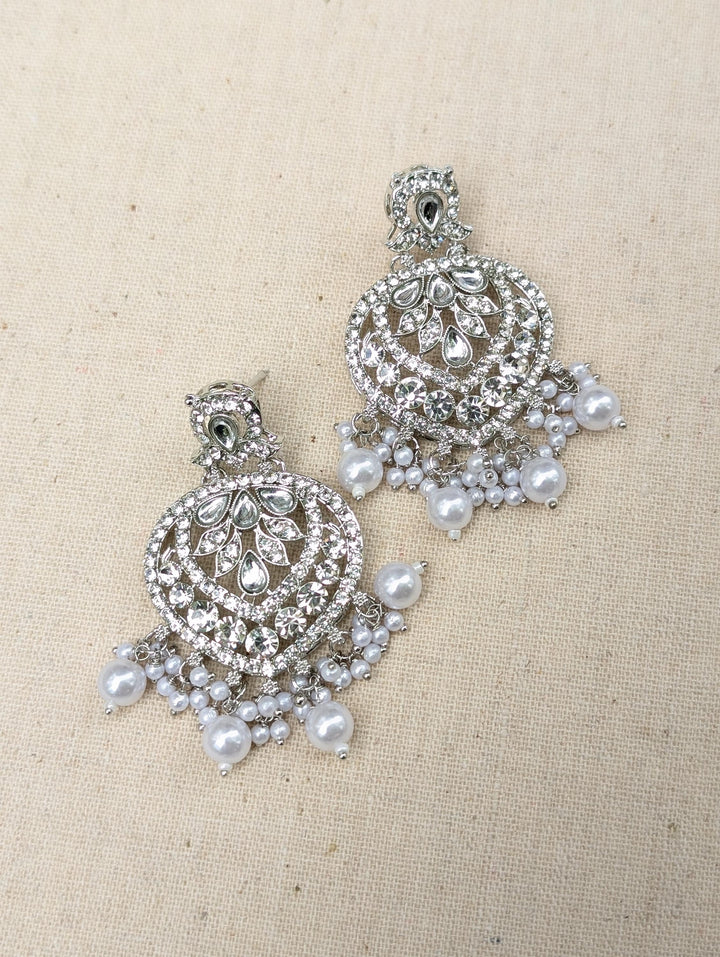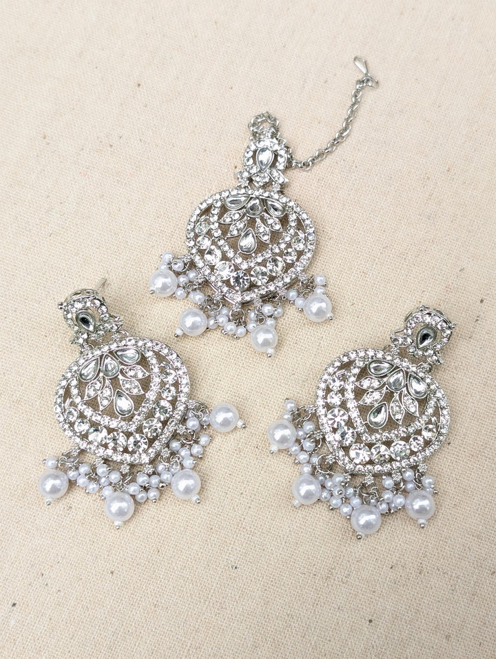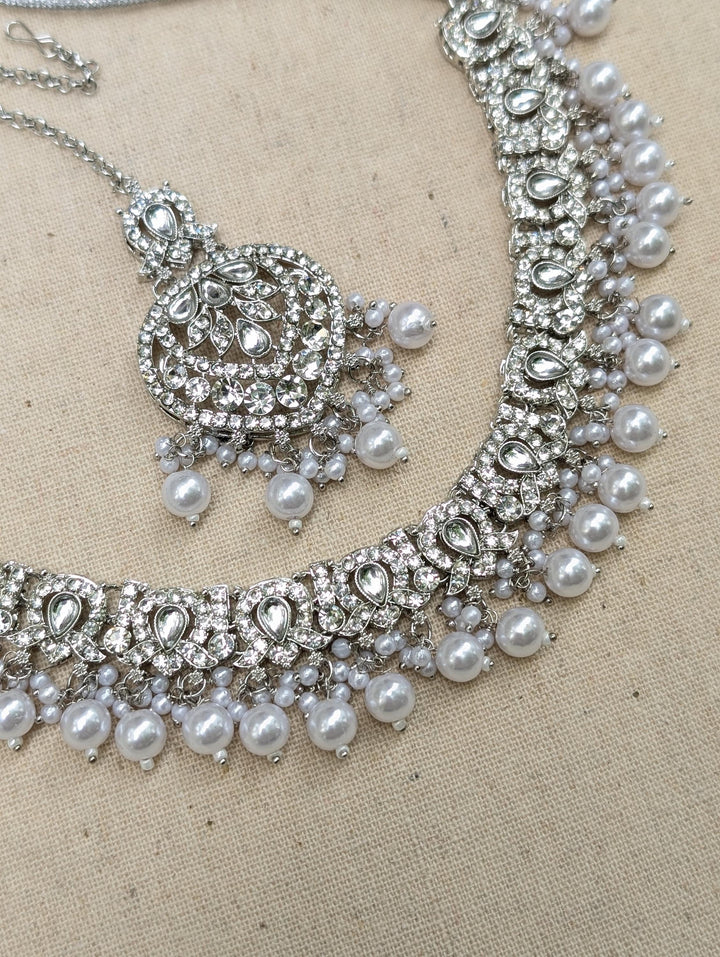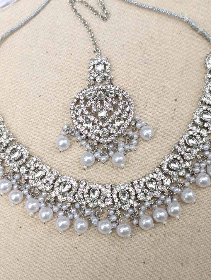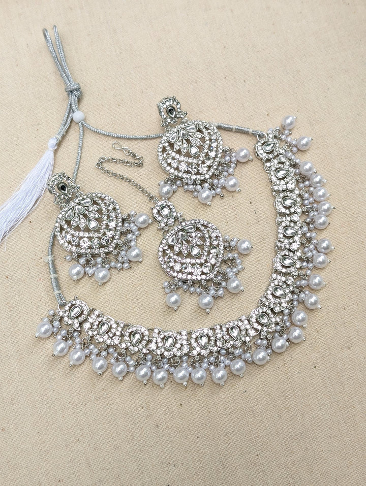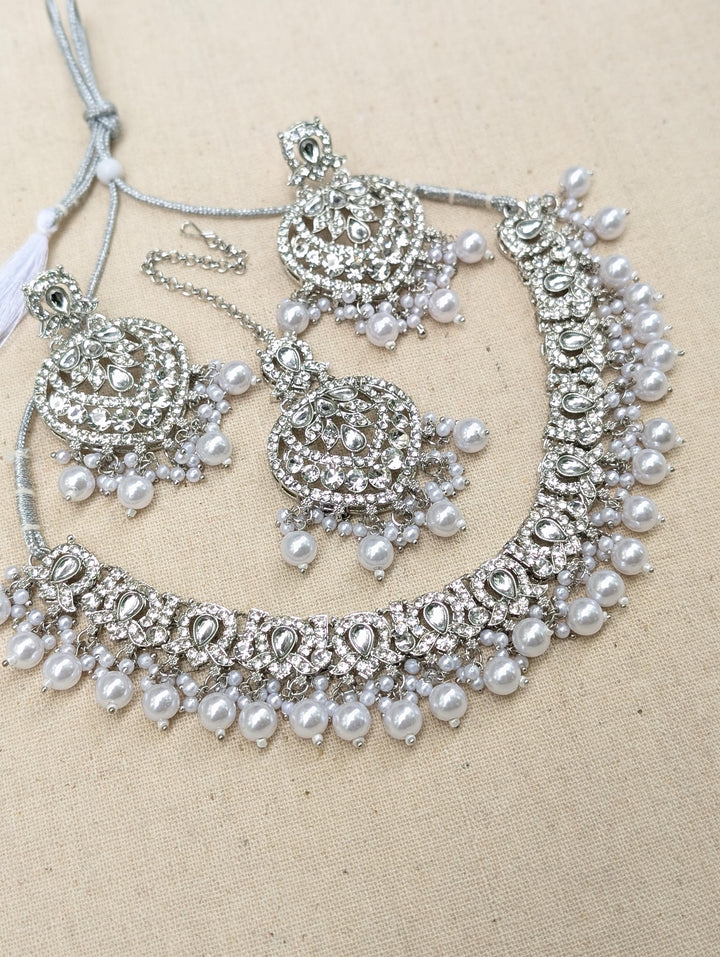 This delicate necklace can be worn as a choker or flat. The perfect white and silver polki necklace set for every South Asian girl that can be worn with any number of outfits. Paired with beautiful light-weight chandbali earrings and tikka.