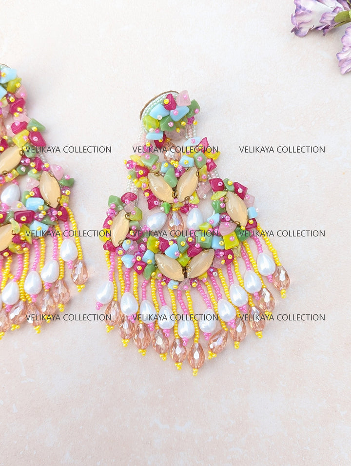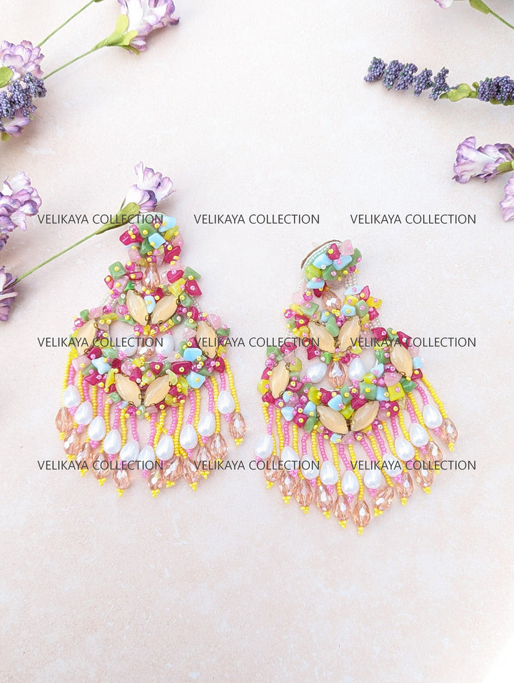 Beaded party wear earrings made with imported Japanese beads in the front and natural fabric in the back. Hot new trend in wedding jewelry. Wear these for mehendi event or a spring summer wedding. Versatile piece for summer dresses & sarees alike.