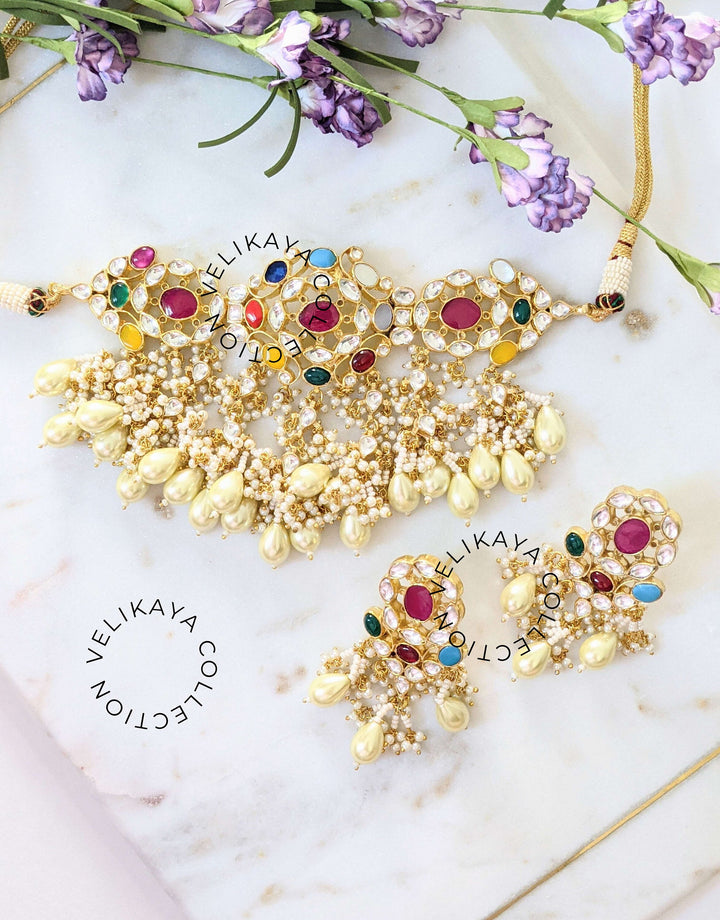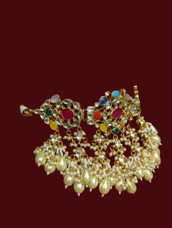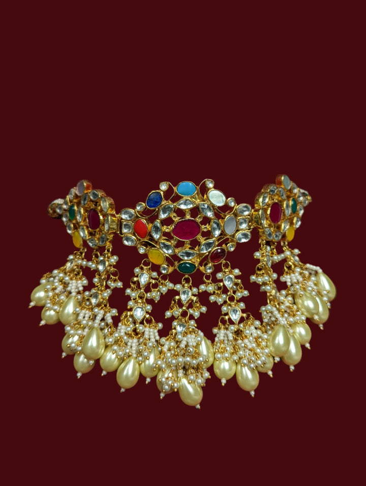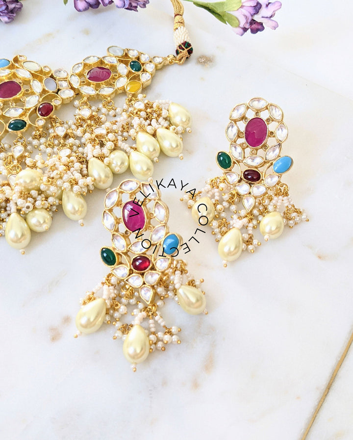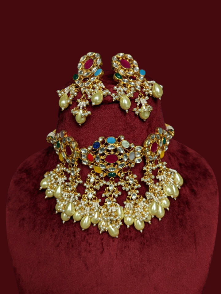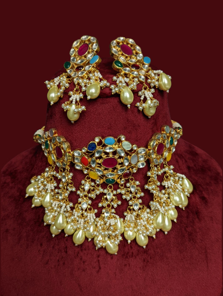 This gold plated Kundan necklace with 'navaratan' stones is elegance personified. Paired with stunning Kundan earrings that are a statement piece on their own.