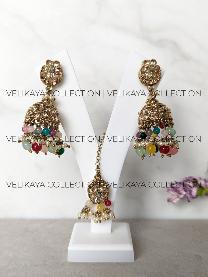 Light weight polki jhumka with tikka. Made with beautiful multicolor beads and sparkling champagne stones. Dainty small jhumka tikka set for when your outfit needs a little bling.