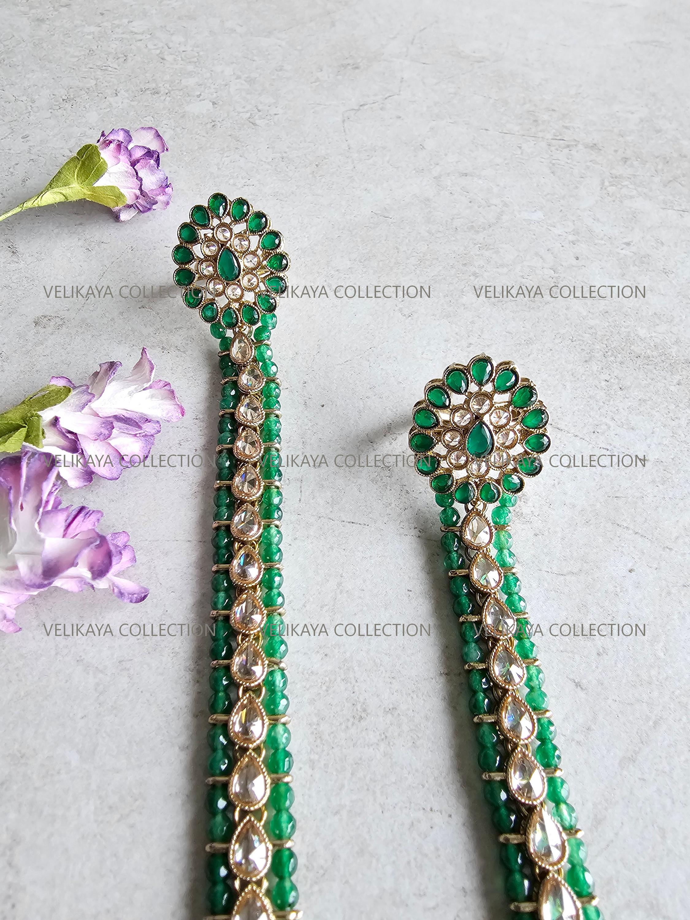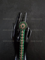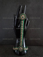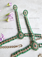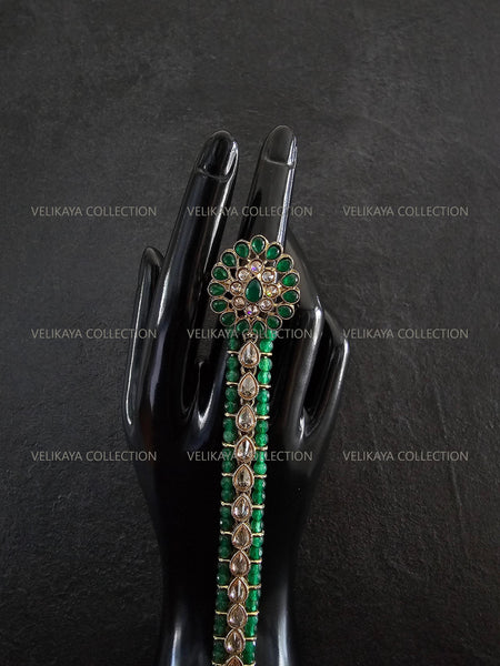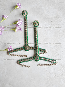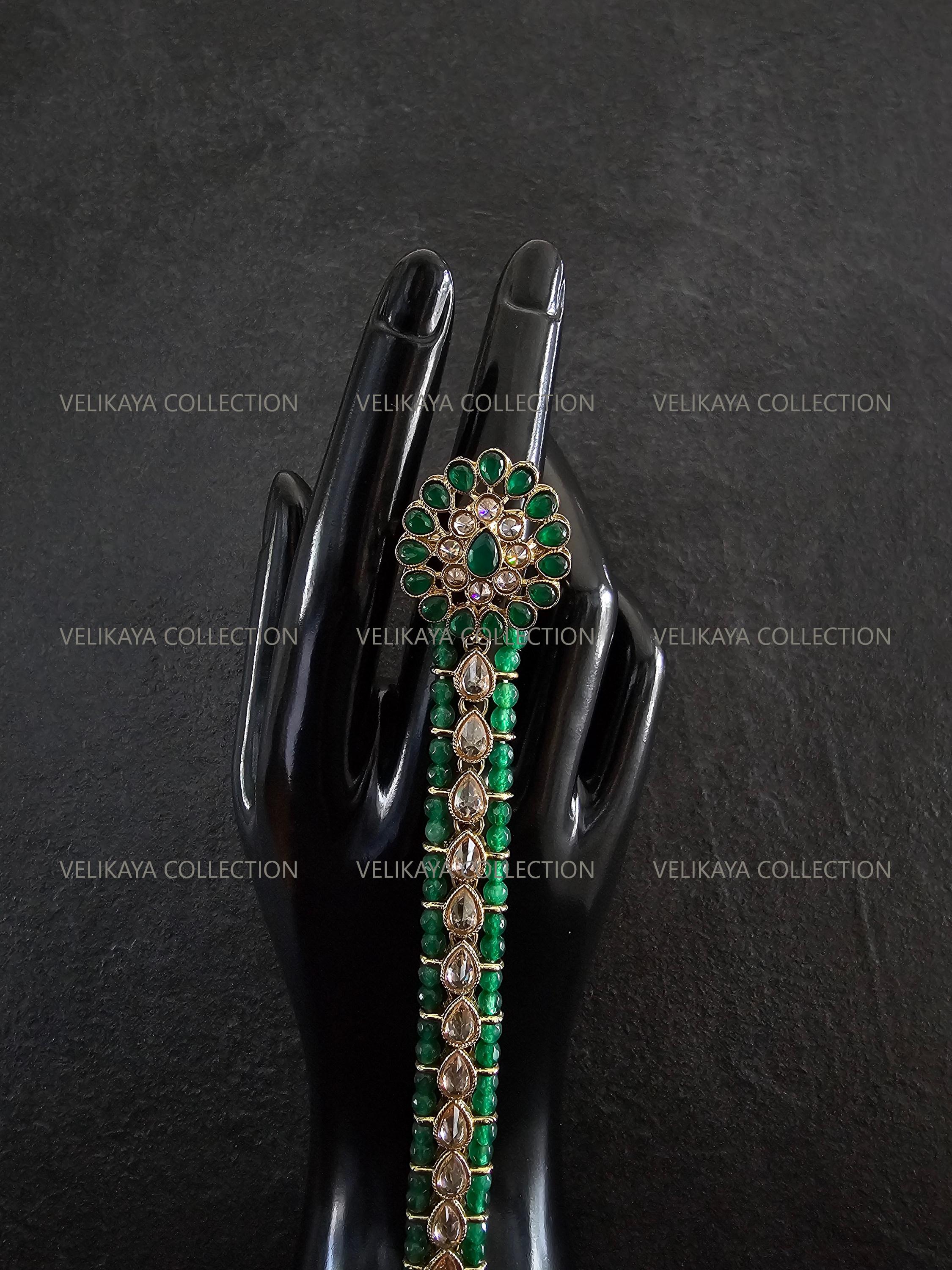 Pair of elegant hathphool / hath panja / hand harness with adjustable ring. Made with high quality champagne stones and antique gold plating.