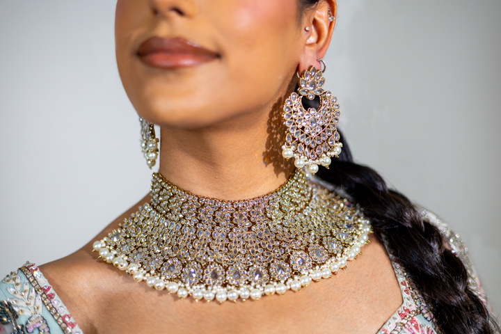 This royal Bollywood bridal choker necklace set is the ultimate statement piece in Pakistani Indian bridal jewelry! Sparkle of these high quality stones and original design is unmatched. Antique gold plating and champagne stones make it a versatile piece that will look great with any color outfit!