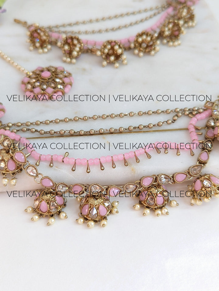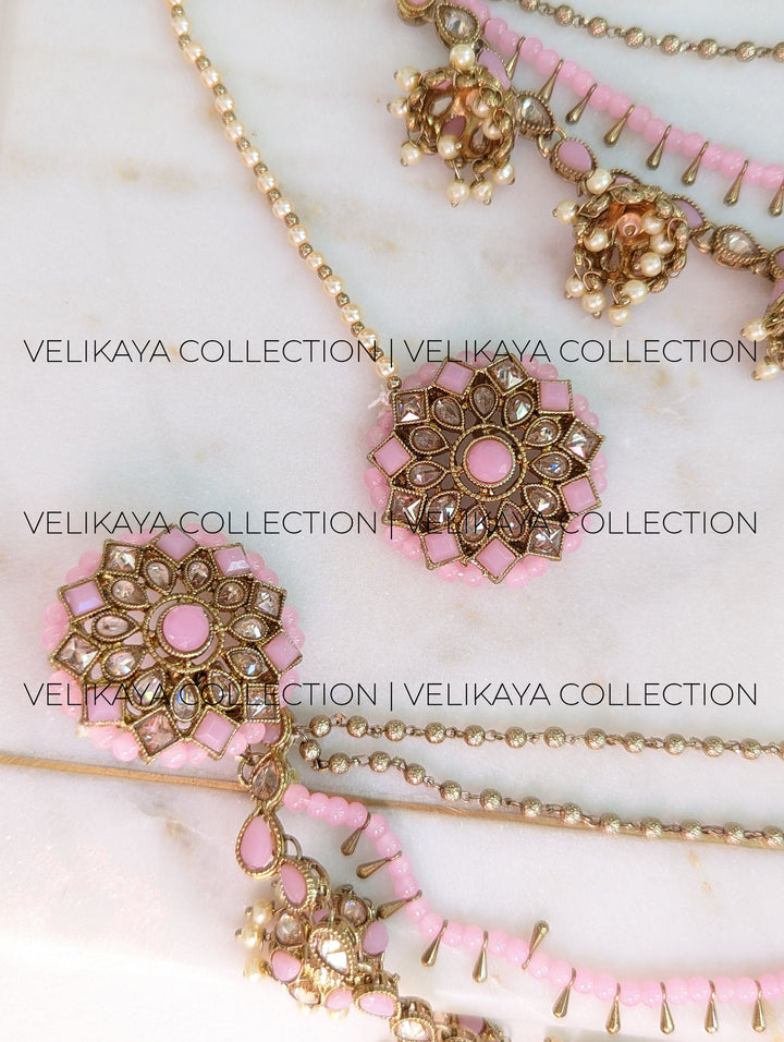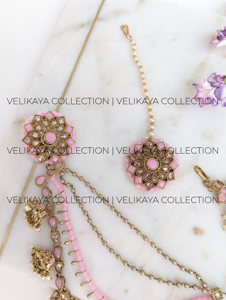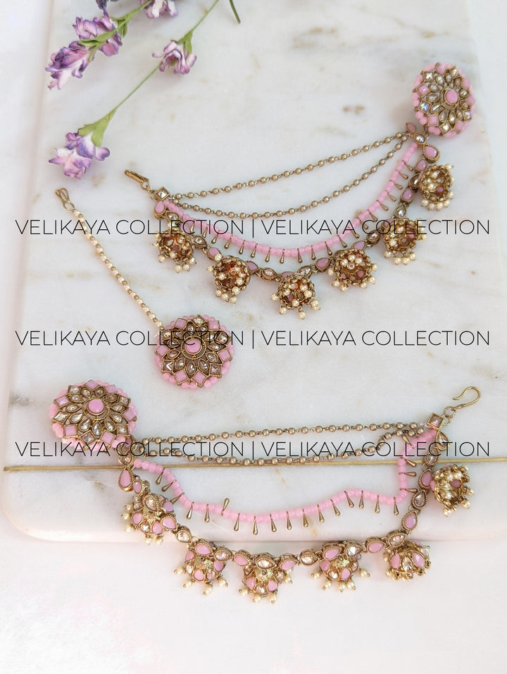 Pink Bahubali Earrings with Ear Chains and Tikka