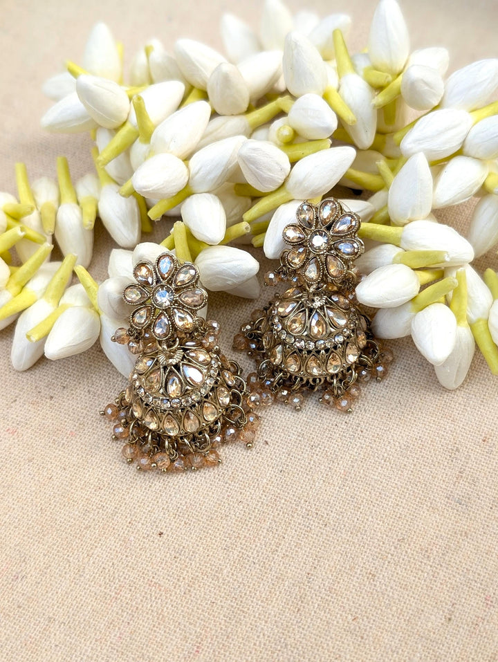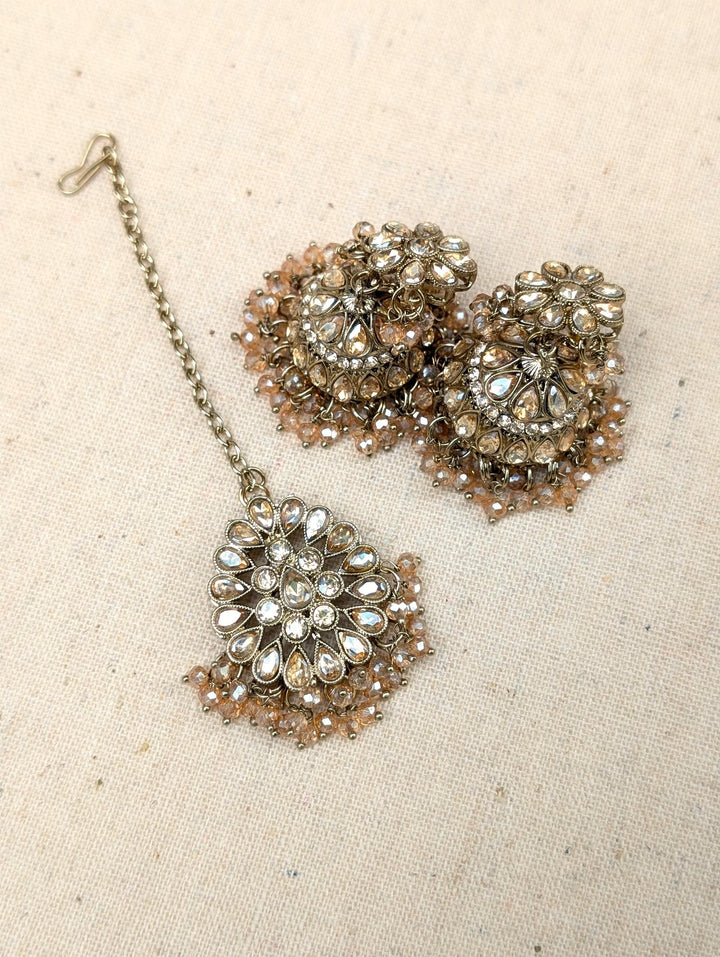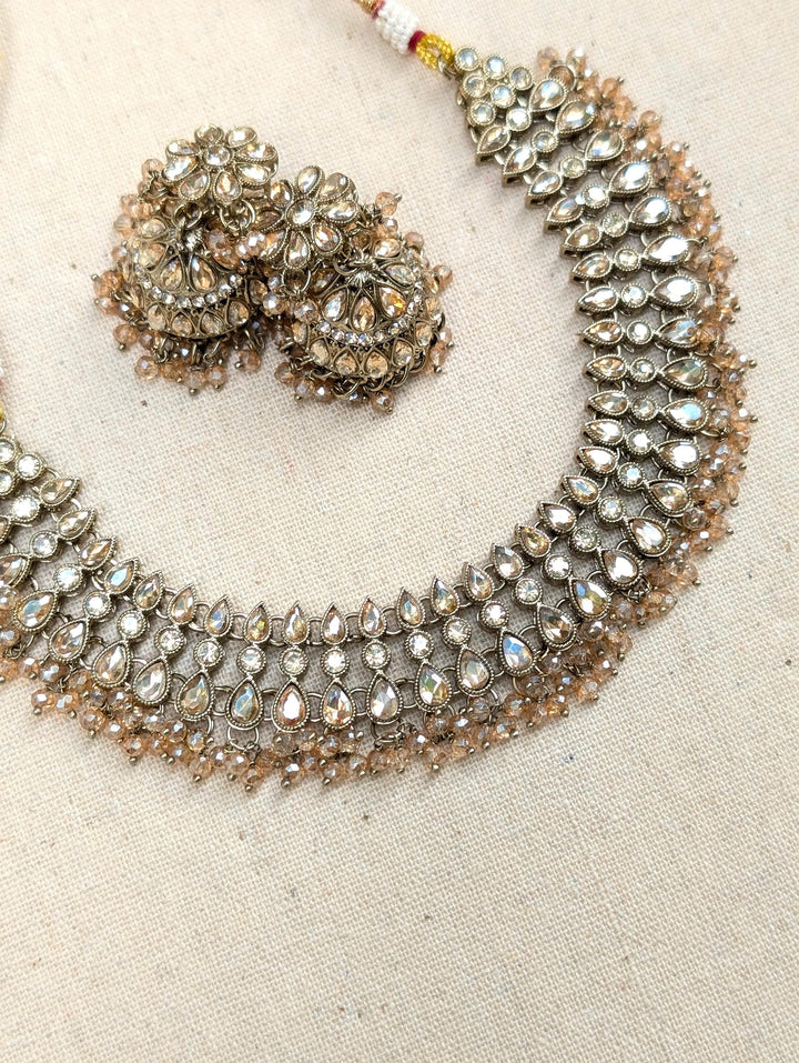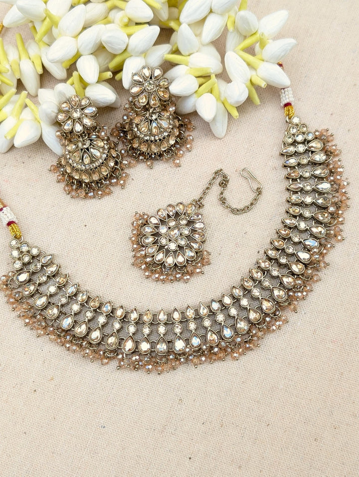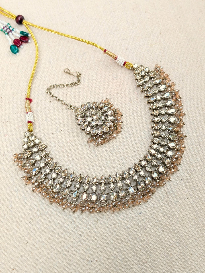 Beautiful polki choker necklace in antique gold plating with matching jhumka and tikka. Highest quality and craftsmanship. Perfect for a more minimalist wedding jewelry look.