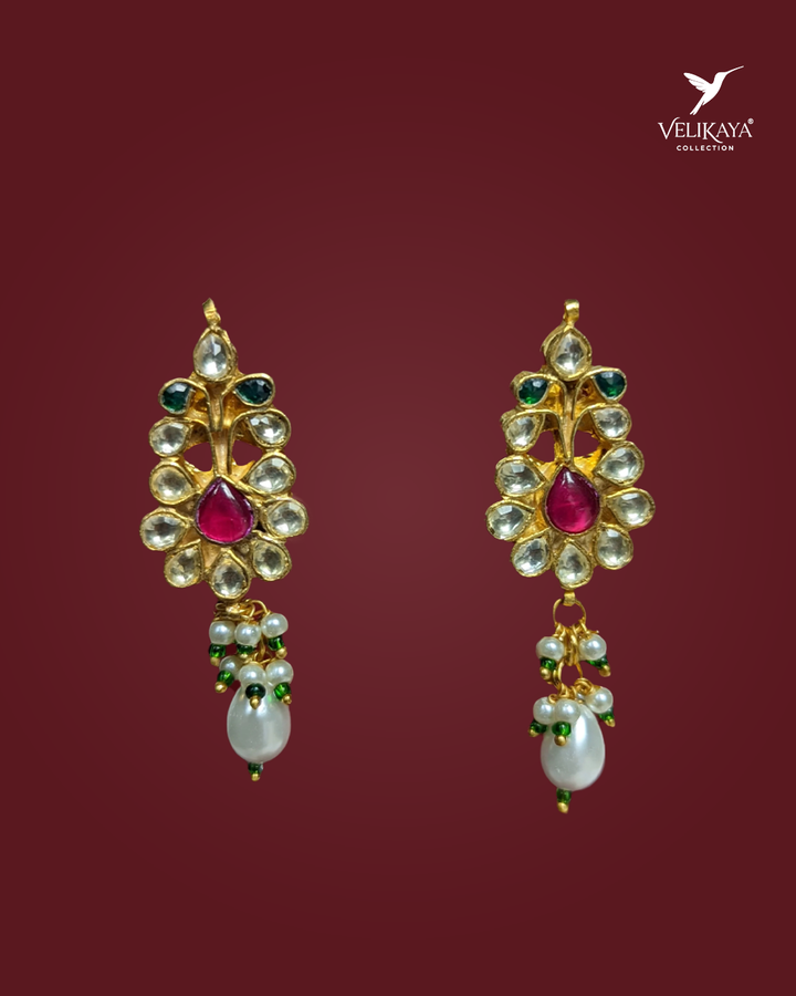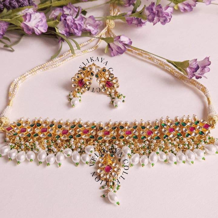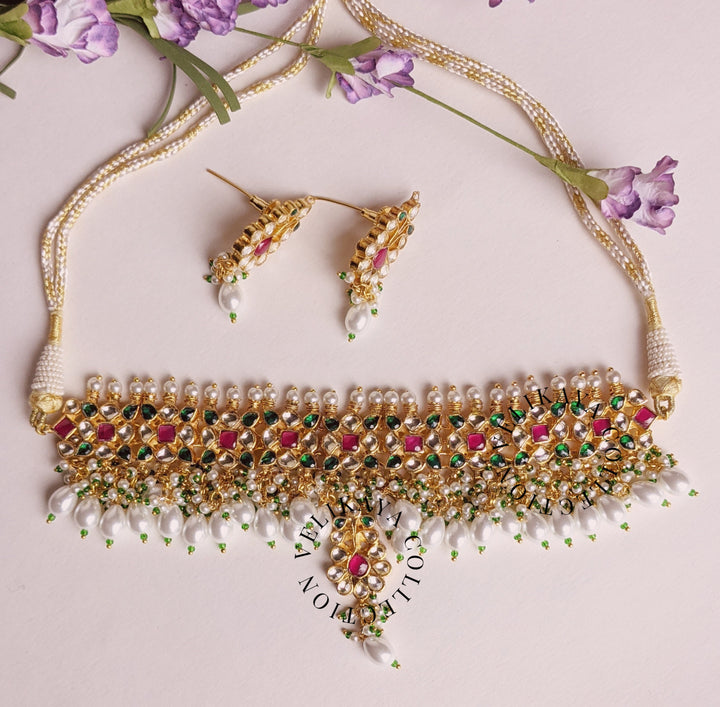 A timeless Kundan choker necklace with emerald-green and ruby-red stones. Adorned with elegant white faux pearls. This necklace has adjustable zari cord (string) to allow a snug fit. Paired with beautiful light-weight kundan studs.