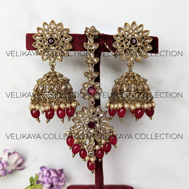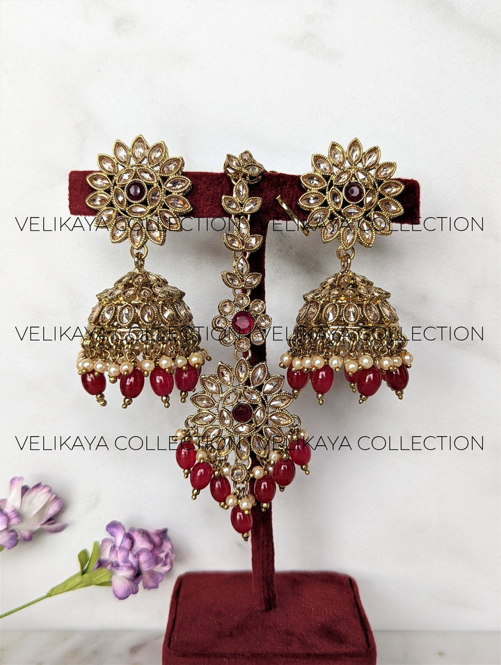 Classic antique gold polki jhumka & tikka set. Made with beautiful faux pearls and sparkling champagne stones. Perfect for when you need minimal party jewelry for an Indian or Pakistani wedding.